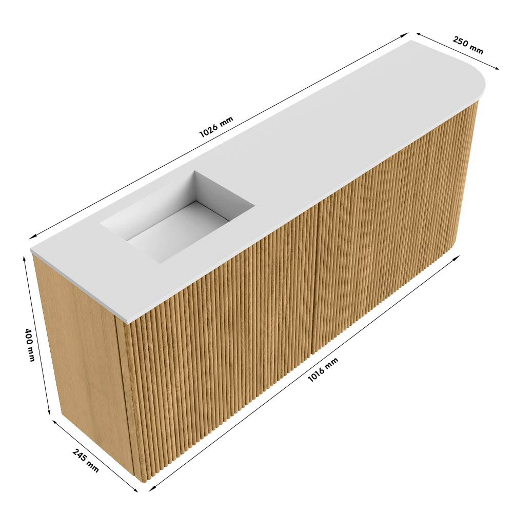 Met een breedte van 101,6 cm en een diepte van 24,5 cm biedt dit meubel voldoende ruimte om al je badkamerbenodigdheden netjes op te bergen. De wastafel is slim gepositioneerd aan de linkerkant met één kraangat, waardoor je eenvoudig een kraan naar keuze kunt installeren. De praktische indeling zorgt voor overzicht en gemak, zodat je badkamer altijd opgeruimd en fris oogt. De afgeronde rechterzijde maakt het meubel bovendien veiliger en toegankelijker in kleinere ruimtes.