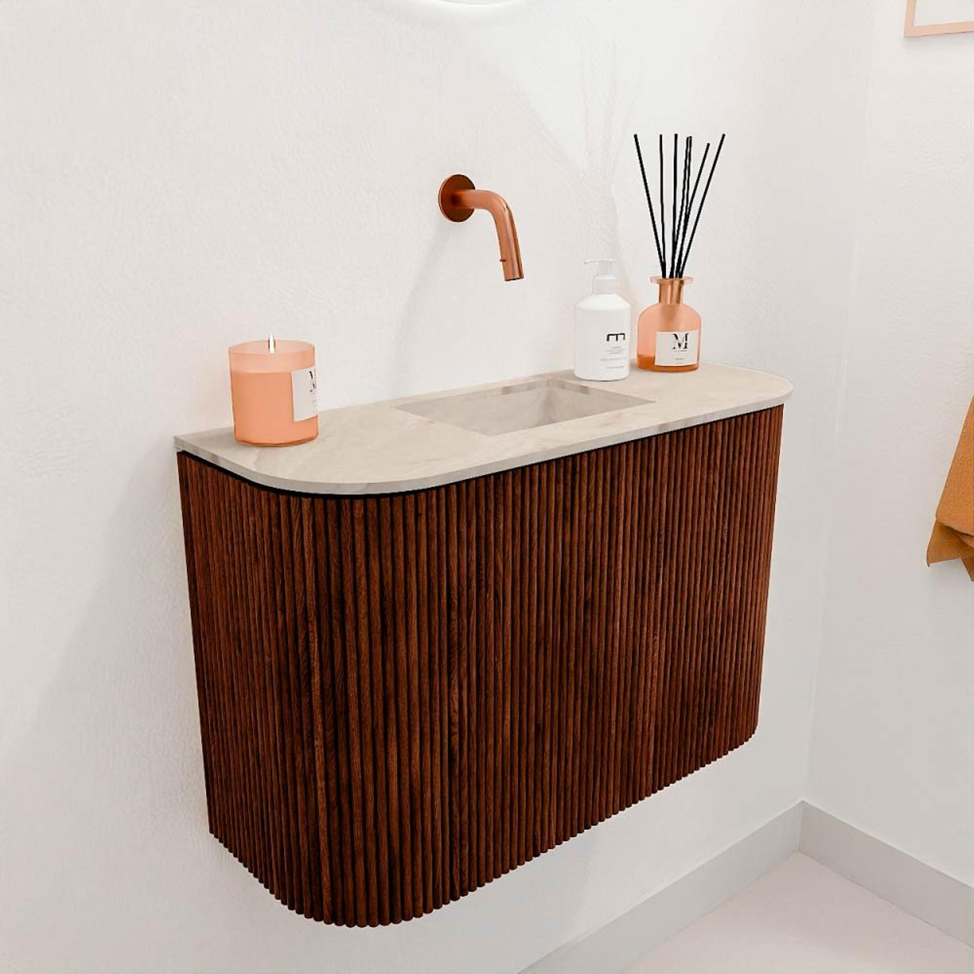 Met dit prachtige meubel geef je jouw badkamer of gastentoilet direct een stijlvolle en warme uitstraling. Het compacte ontwerp met een breedte van 63,2 cm en een diepte van slechts 24,5 cm maakt het ideaal voor kleinere ruimtes waar je toch niet wilt inleveren op comfort en design. De subtiele rondingen aan beide zijden zorgen voor een zachte, uitnodigende look die perfect samengaat met de rijke ruby kleur van het meubel. De wastafel in de kleur Frappe, centraal geplaatst zonder kraangat, biedt je de vrijheid om zelf de kraan te kiezen die het beste bij jouw stijl past. Dit meubel transformeert jouw ruimte in een plek waar functionaliteit en elegantie hand in hand gaan, en waar je elke dag met plezier begint en eindigt.