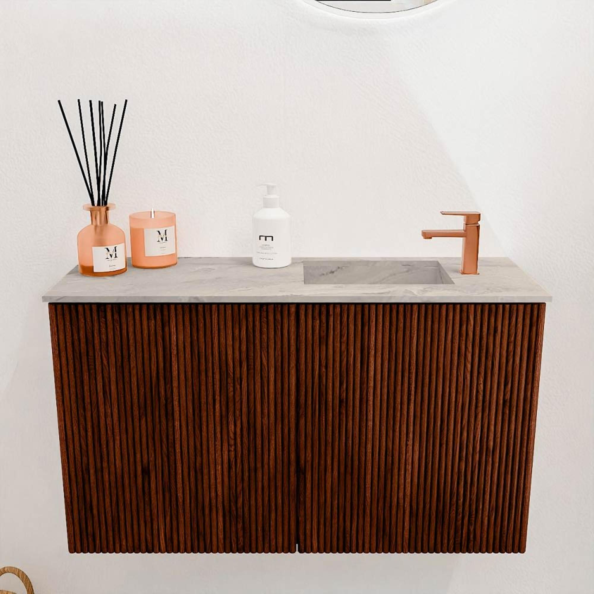 Transformeer jouw badkamer met dit prachtige meubel dat niet alleen praktisch is, maar ook een echte blikvanger vormt. De combinatie van een warme Ruby-kleur met een subtiele Glace-wastafel zorgt voor een stijlvolle en uitnodigende sfeer. Dankzij het doordachte ontwerp geniet je van optimaal gebruiksgemak en een overzichtelijke opbergruimte, waardoor je badkamer er altijd netjes en verzorgd uitziet. Dit meubel voegt niet alleen functionaliteit toe, maar tilt ook de uitstraling van je ruimte naar een hoger niveau. Of je nu een complete make-over plant of een subtiele upgrade zoekt, dit meubel past perfect in elke moderne badkamer.