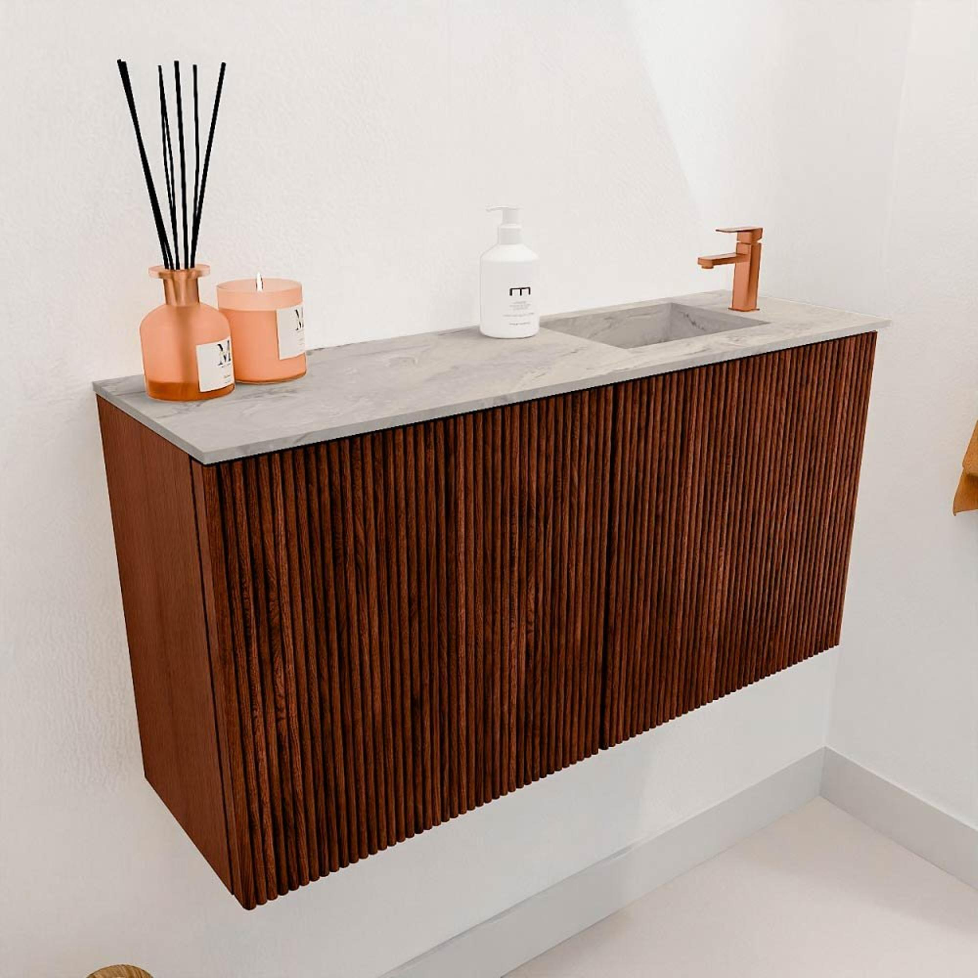 Met dit prachtige meubel geef je jouw badkamer of toiletruimte direct een stijlvolle en warme uitstraling. Het compacte formaat van 80 cm breed maakt het ideaal voor kleinere ruimtes, zonder in te leveren op functionaliteit. De combinatie van het kastje in de diepe, rijke kleur Ruby met de elegante wastafel in de subtiele kleur Glace zorgt voor een verfijnde balans tussen kracht en rust. Dankzij de slimme indeling en het praktische design creëer je eenvoudig extra opbergruimte voor al je badkamerbenodigdheden, terwijl de wastafel met kraangat rechts perfect aansluit op jouw bestaande installatie. Dit meubel verandert jouw badkamer in een plek waar je elke dag met plezier begint en eindigt.