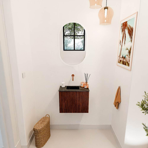 De combinatie van de diepe ruby kleur met het lava-kleurige wastafelblad geeft het meubel een unieke en verfijnde uitstraling. De verticale ribbelstructuur in het hout zorgt voor een subtiele textuur die het design extra karakter geeft. Dit meubel past perfect in een moderne badkamer, maar voegt ook warmte toe aan een klassiekere inrichting. Door het gebruik van hoogwaardige materialen zoals massief eikenhout en eikenfineer straalt het meubel luxe en duurzaamheid uit. Zo creëer je een badkamer die niet alleen mooi is, maar ook een echte blikvanger wordt.