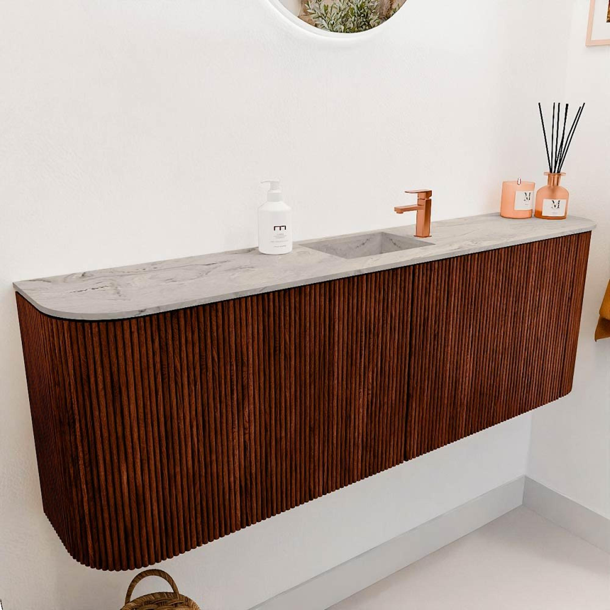 De elegante rondingen aan beide zijden van het meubel maken het tot een uniek en stijlvol element in jouw badkamer. De warme Ruby-kleur in combinatie met het subtiele Glace wastafelblad zorgt voor een harmonieuze uitstraling die zowel modern als tijdloos is. Dit meubel past perfect in diverse interieurstijlen, van strak en minimalistisch tot warm en natuurlijk. Door de doordachte vormgeving wordt jouw badkamer een plek waar je elke dag met plezier begint en eindigt.