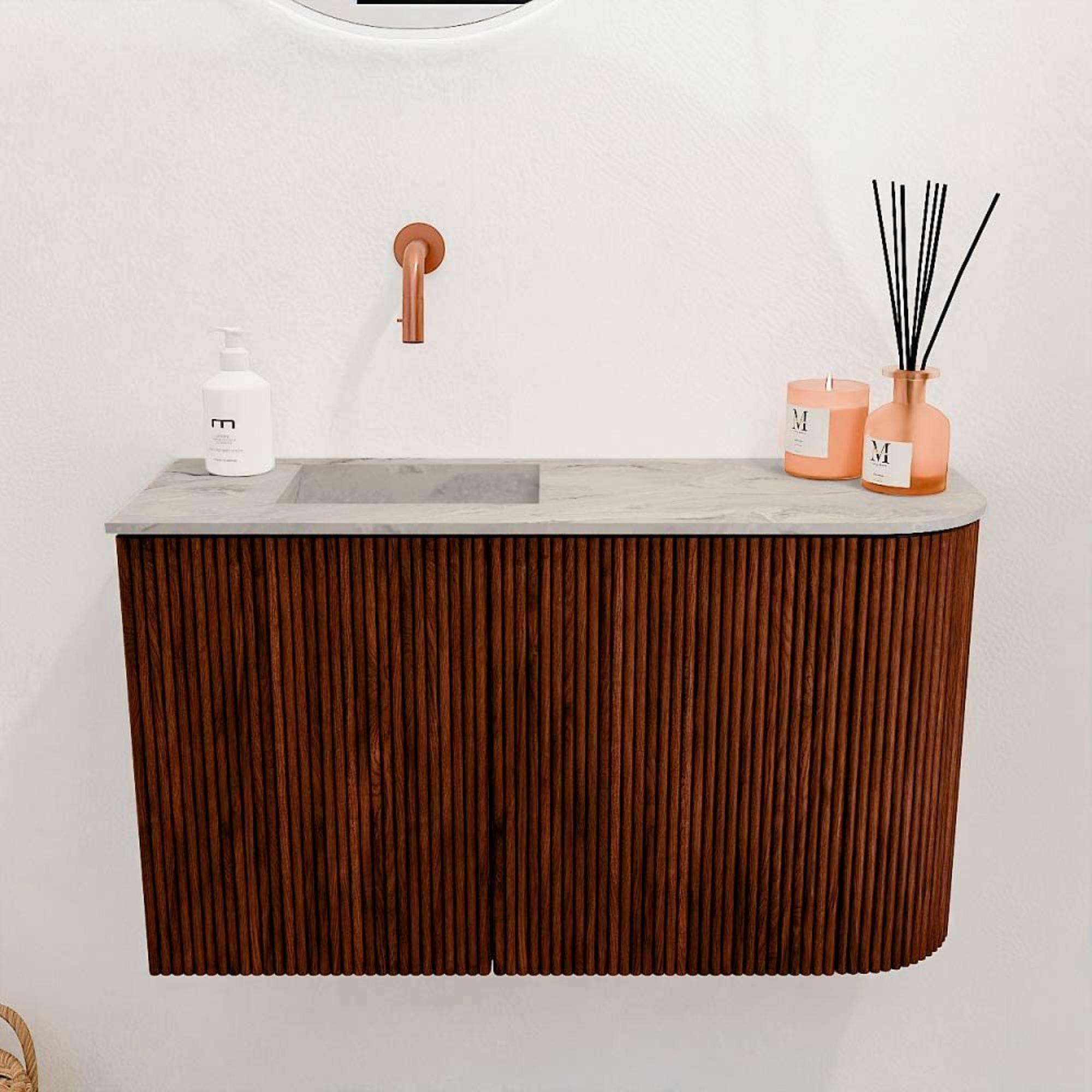 De opvallende Ruby kleur met een glanzende Glace afwerking maakt dit meubel tot een echte blikvanger. De afgeronde rechterzijde geeft het een uniek en modern karakter, dat moeiteloos aansluit bij diverse interieurstijlen. Of je nu kiest voor een strakke, minimalistische inrichting of juist een warme, natuurlijke sfeer, dit meubel voegt altijd een verfijnde touch toe. Door de combinatie van kleur en vorm creëer je een badkamer die niet alleen praktisch is, maar ook uitnodigend en persoonlijk aanvoelt. Zo geniet je elke dag van een stijlvolle omgeving die jouw smaak perfect weerspiegelt.
