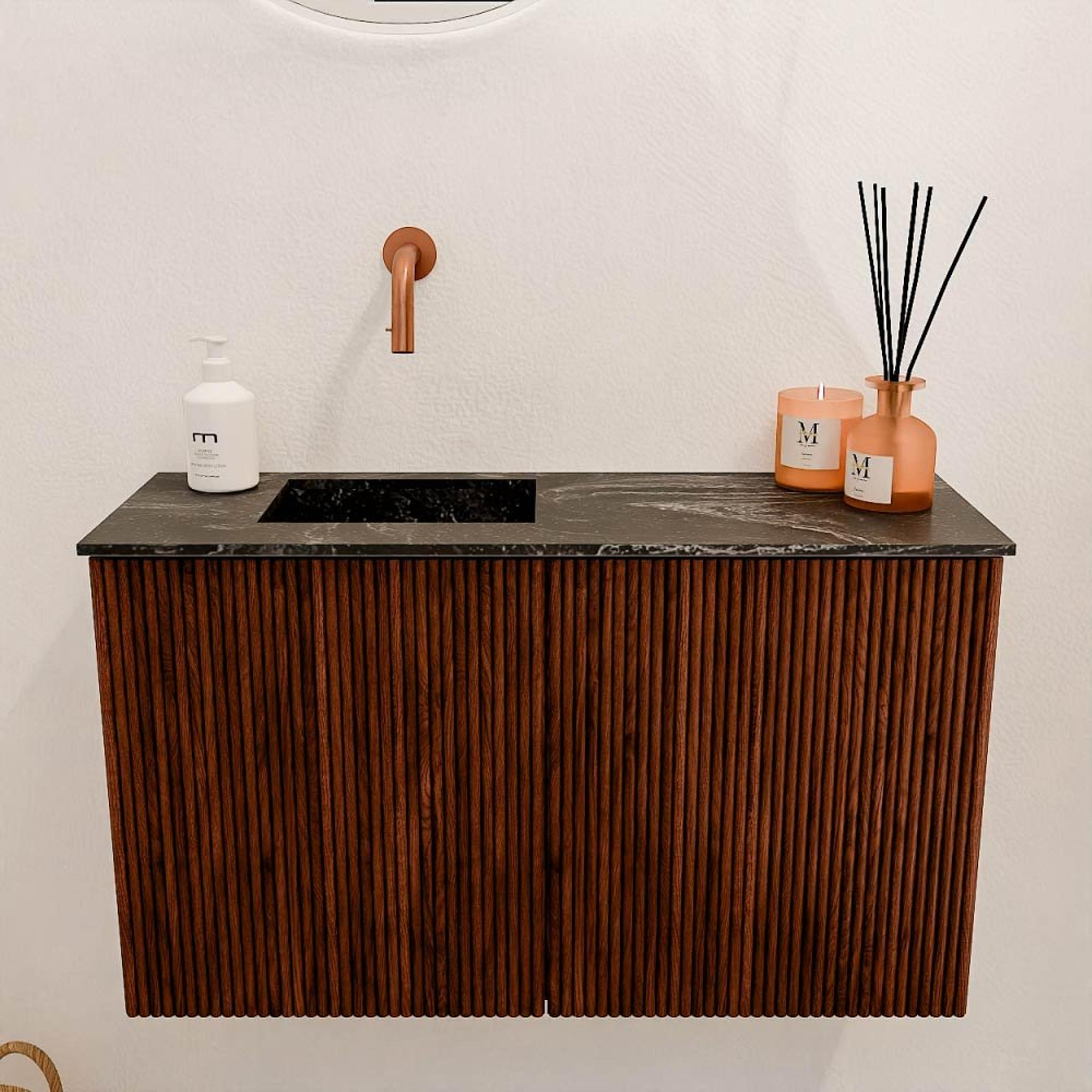 De warme Ruby-kleur geeft het meubel een opvallende en toch tijdloze uitstraling. Het design is modern en minimalistisch, waardoor het moeiteloos aansluit bij diverse interieurstijlen. Het gebruik van echt hout voegt een natuurlijke touch toe die je badkamer direct een luxe gevoel geeft. Door de subtiele details en de strakke lijnen creëer je een ruimte die niet alleen mooi oogt, maar ook rust uitstraalt. Dit meubel is een echte blikvanger die jouw badkamer een unieke identiteit geeft.