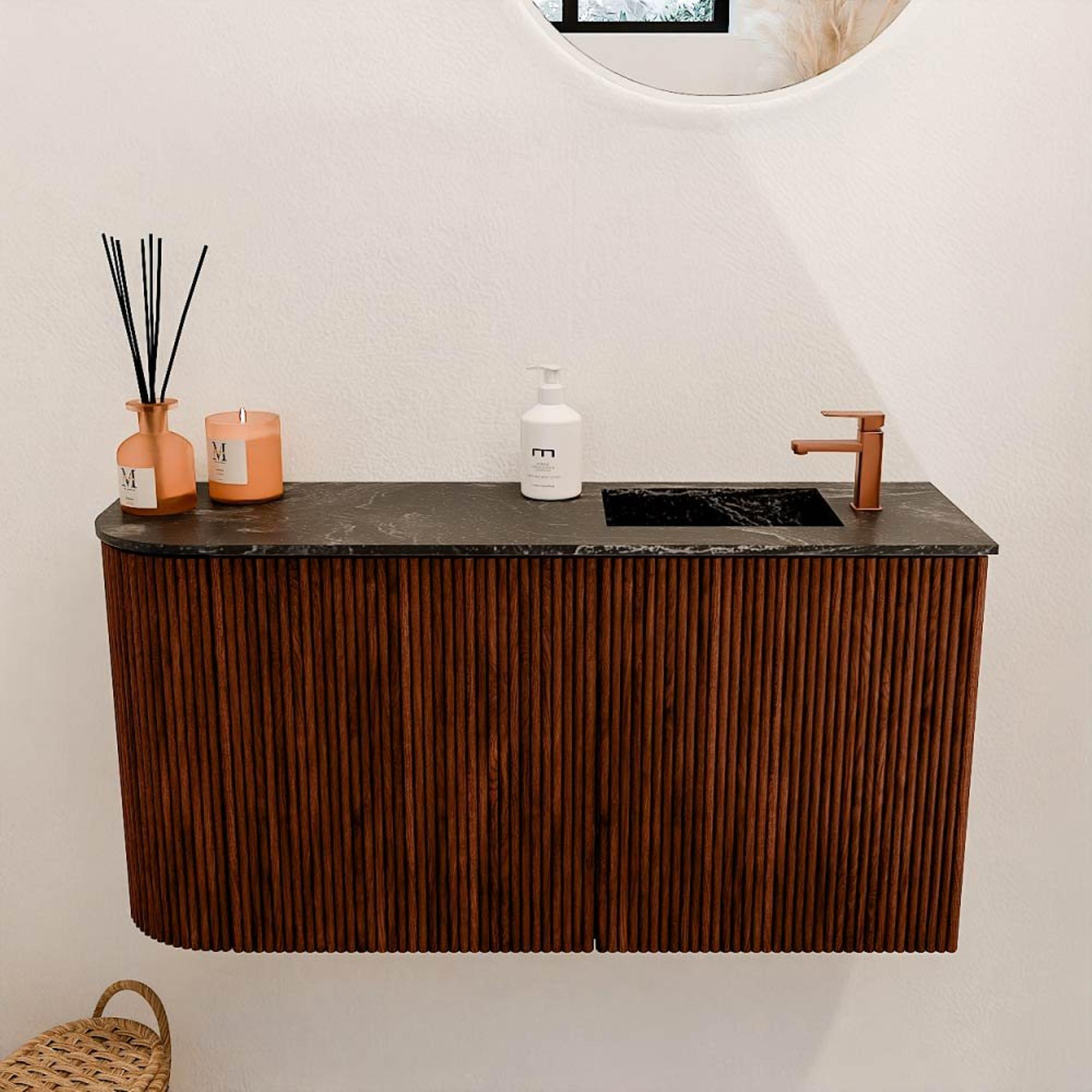 Dit meubel valt direct op door zijn verfijnde uitstraling. De warme ruby-kleur gecombineerd met de verticale groeven in het massief eikenhout geeft het een unieke en natuurlijke charme. Het design is modern en toch tijdloos, waardoor het moeiteloos aansluit bij verschillende badkamerstijlen. De subtiele ronding aan de linkerkant zorgt voor een speels effect, wat het meubel net dat beetje extra karakter geeft. Door deze stijlvolle details geniet je niet alleen van een functioneel meubel, maar ook van een echte blikvanger in jouw badkamer.