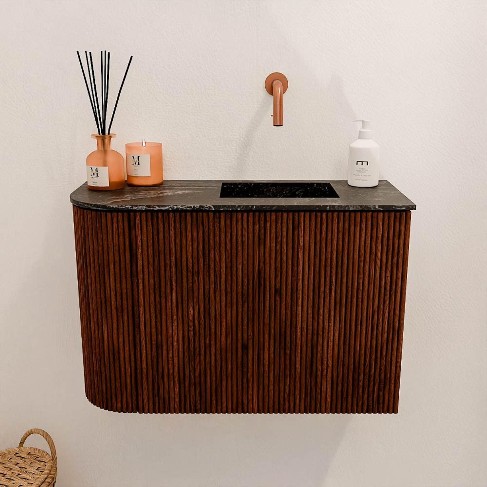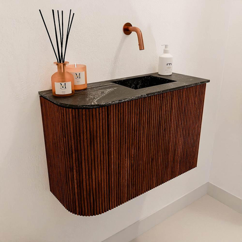De opvallende Ruby-kleur in combinatie met de subtiele ronding aan de linkerkant maakt dit meubel tot een echte blikvanger. Het verticale ribbelpatroon op de fronten voegt een speels en eigentijds detail toe, waardoor het meubel zich moeiteloos laat integreren in diverse interieurstijlen. Of je nu kiest voor een moderne, minimalistische badkamer of juist een warme, natuurlijke uitstraling, dit meubel past zich aan en versterkt de sfeer. Zo creëer je een badkamer die niet alleen functioneel is, maar ook een lust voor het oog.