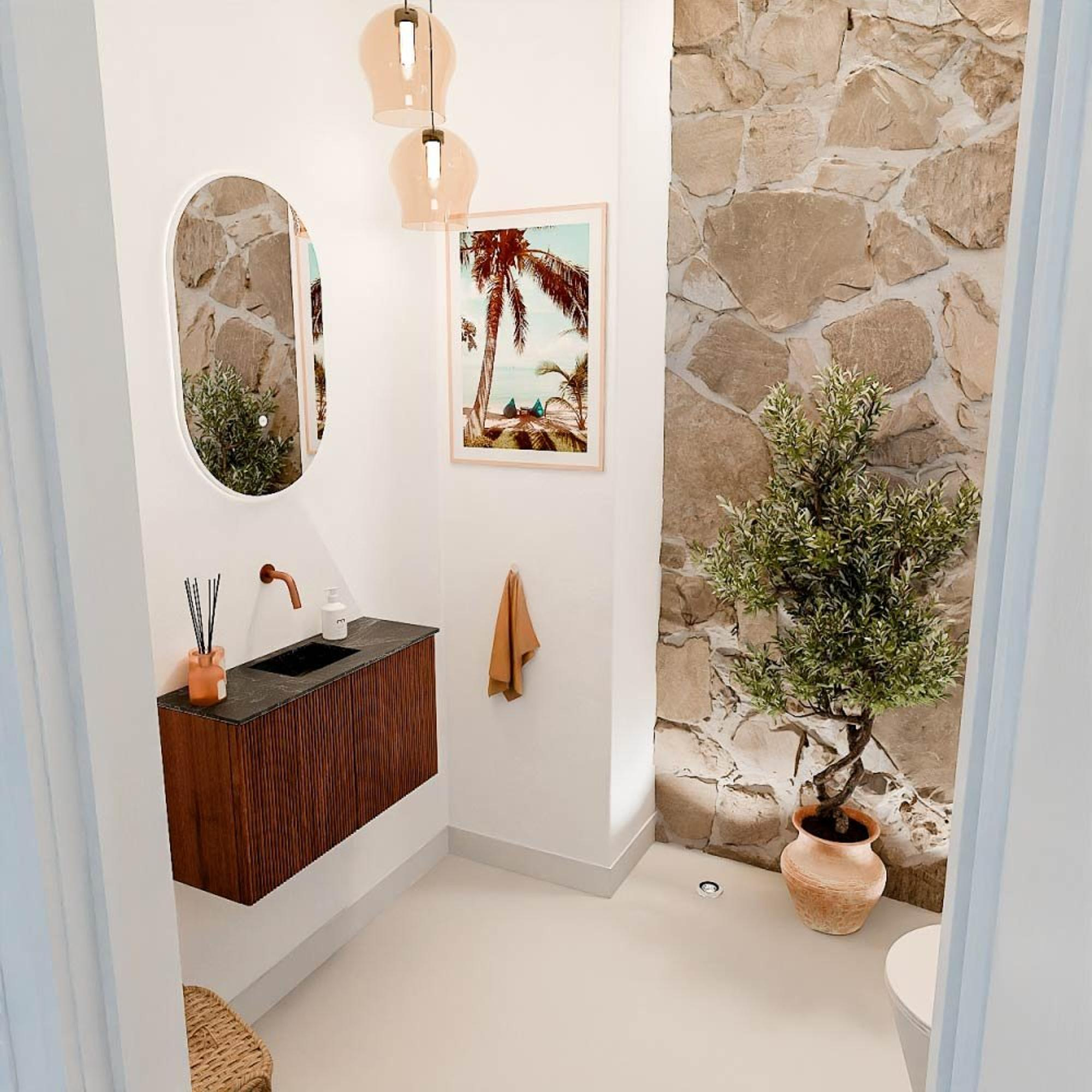 Transformeer jouw badkamer met dit prachtige meubel dat niet alleen praktisch is, maar ook een echte eyecatcher vormt. Dankzij het compacte formaat van 70 cm breed past het perfect in kleinere ruimtes, terwijl het toch voldoende opbergruimte biedt om jouw badkamer netjes en georganiseerd te houden. De combinatie van de warme Ruby-kleur met de stijlvolle Lava-wastafel zorgt voor een moderne en uitnodigende sfeer. Dit meubel is ontworpen om eenvoudig aan de wand te worden gemonteerd, waardoor je vloer vrij blijft en de ruimte optisch groter lijkt. De wastafel is centraal geplaatst zonder kraangat, wat je de vrijheid geeft om zelf een kraan te kiezen die bij jouw stijl en wensen past. Zo geniet je van een badkamer die niet alleen functioneel is, maar ook helemaal aansluit bij jouw persoonlijke smaak.