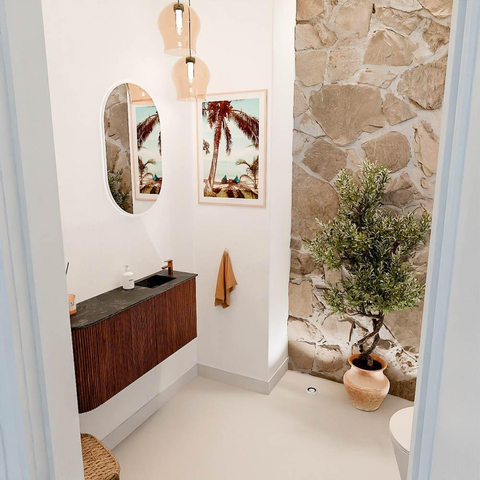 Met dit prachtige meubel geef je jouw badkamer direct een stijlvolle en warme uitstraling. De combinatie van de robuuste, natuurlijke materialen en de opvallende kleur zorgt voor een unieke sfeer waarin comfort en design samenkomen. Dankzij het doordachte ontwerp met een subtiele ronding aan de linkerkant past dit meubel perfect in diverse badkamerindelingen, terwijl de wastafel met rechts geplaatste kraangat het gebruiksgemak verhoogt. Het meubel nodigt uit tot ontspannen momenten en maakt van jouw badkamer een plek waar je elke dag met plezier begint en eindigt.