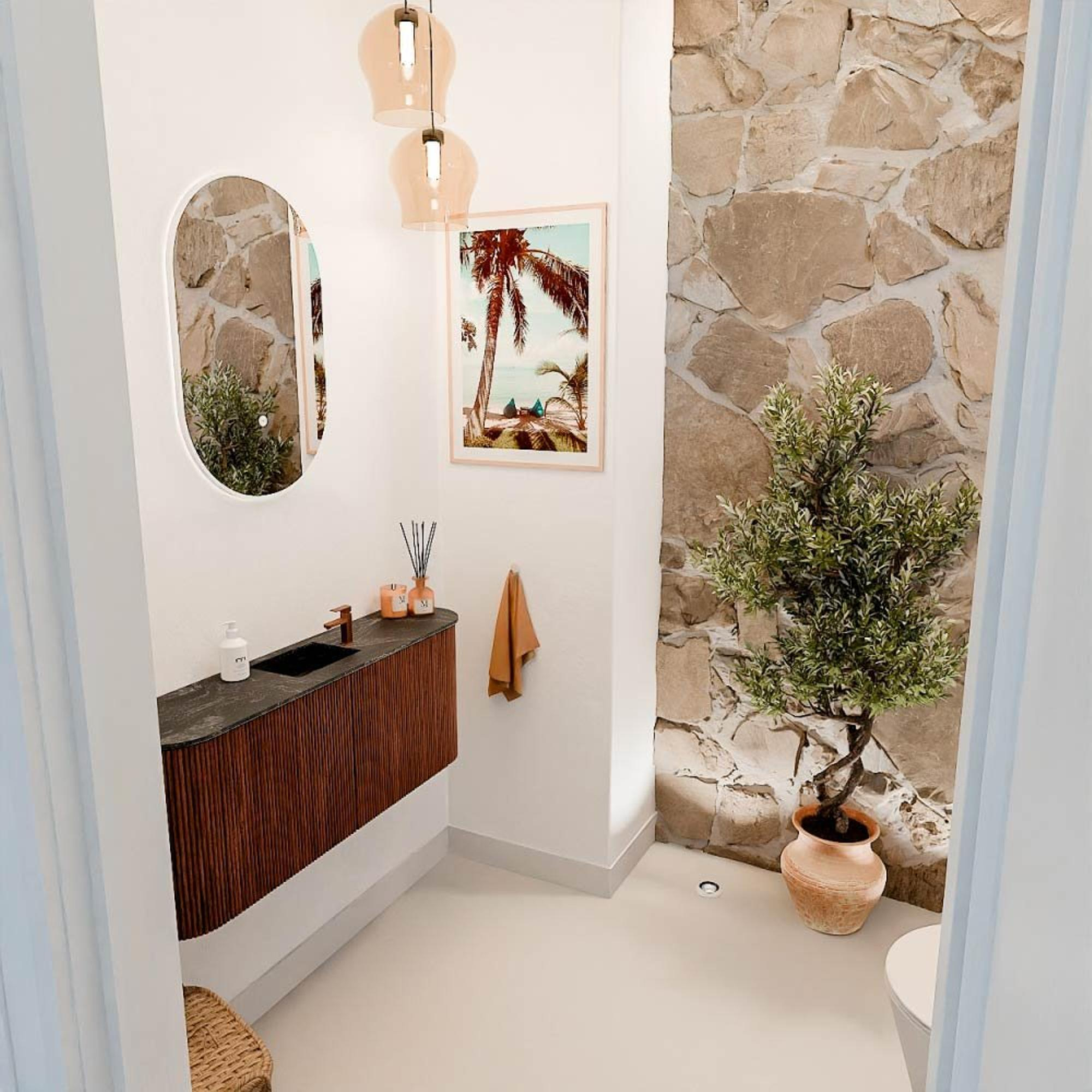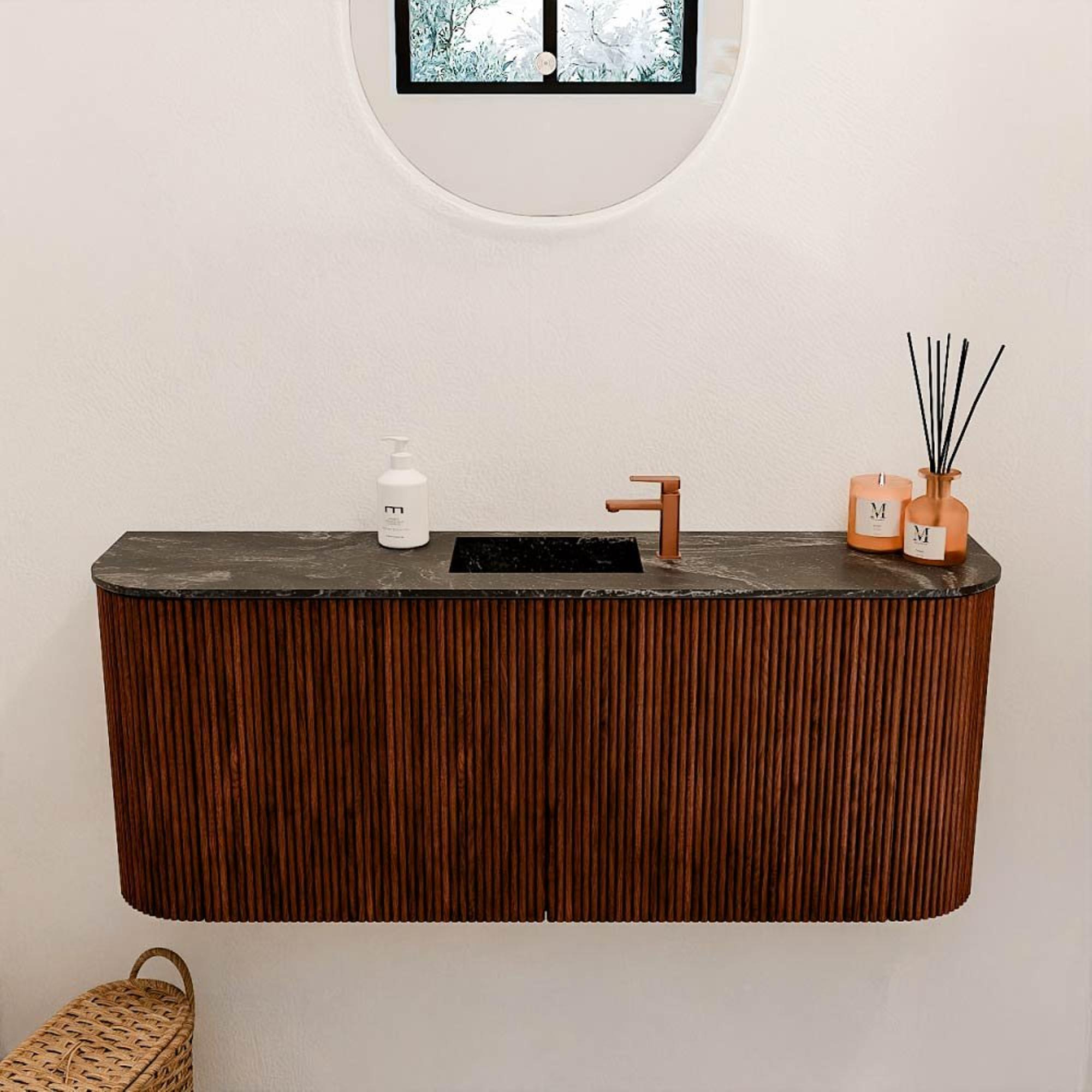 Met dit prachtige meubel geef je jouw badkamer of gastentoilet direct een stijlvolle en warme uitstraling. Het combineert een verfijnde vormgeving met praktische functionaliteit, waardoor je niet alleen geniet van een mooie ruimte, maar ook van optimaal gebruiksgemak. De subtiele rondingen aan beide zijden zorgen voor een zachte, uitnodigende look die perfect past in moderne interieurs. Dankzij de royale breedte van 103,2 cm heb je voldoende opbergruimte om al je badkamerbenodigdheden netjes en overzichtelijk op te bergen. De wastafel, centraal geplaatst en uitgevoerd in een diepe Lava-kleur, vormt een opvallend contrast met het robijnrode meubel en geeft jouw ruimte een unieke, luxe uitstraling. Dit meubel is niet alleen een blikvanger, maar ook een slimme keuze voor wie kwaliteit en design hoog in het vaandel heeft staan.