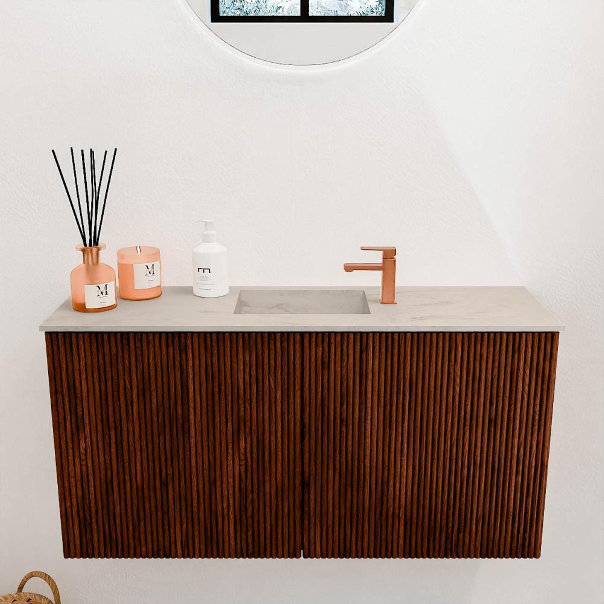 Het meubel valt direct op door het verticale ribbelpatroon op de fronten, uitgevoerd in massief eikenhout met een elegante Ruby-kleur. Dit geeft een moderne, maar toch tijdloze uitstraling die moeiteloos past in diverse interieurstijlen. De combinatie van het warme hout en het strakke design zorgt voor een harmonieus geheel dat jouw badkamer een unieke uitstraling geeft. Door deze stijlvolle afwerking maak je van een functioneel meubelstuk een echte eyecatcher die je badkamer naar een hoger niveau tilt.