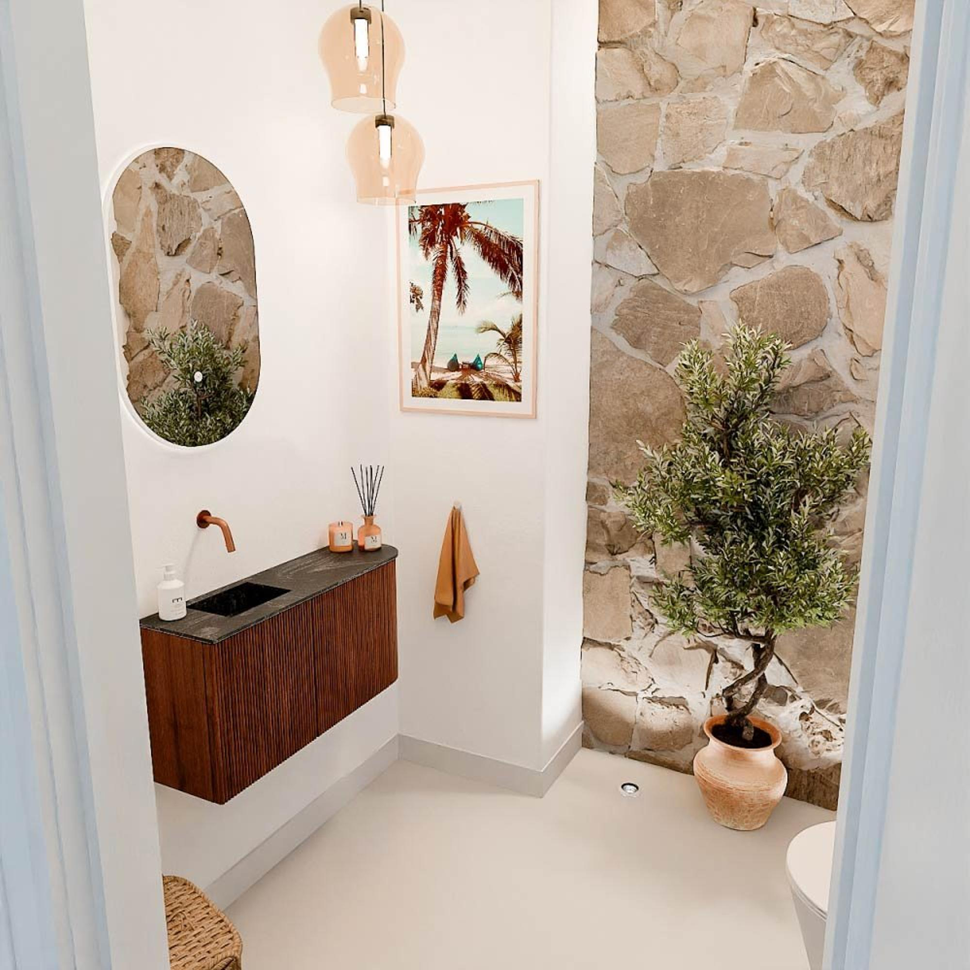 Met zijn warme Ruby-kleur en de natuurlijke uitstraling van massief eikenhout straalt dit meubel pure elegantie uit. De subtiele ronding aan de rechterkant geeft het een uniek karakter dat direct opvalt. Door de combinatie met de Lava-kleurige wastafel ontstaat een modern contrast dat jouw badkamer een eigentijdse en luxe sfeer geeft. Dit meubel is een perfecte keuze als je waarde hecht aan een stijlvolle inrichting die tegelijkertijd tijdloos blijft. Zo creëer je een badkamer die niet alleen nu, maar ook over jaren nog steeds prachtig is.