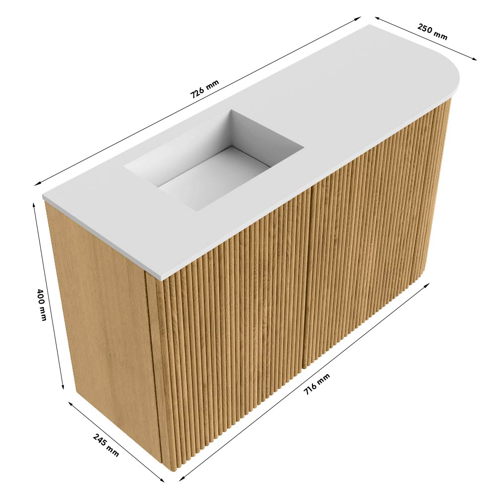 Met een breedte van 71,6 cm en een diepte van 24,5 cm biedt dit meubel voldoende opbergruimte zonder dat het te veel ruimte inneemt. De wandmontage zorgt voor een luchtige uitstraling en maakt schoonmaken eenvoudig. De wastafel met één kraangat aan de linkerzijde is ideaal voor een praktische indeling en zorgt voor een comfortabele gebruikservaring. Dit meubel is daarmee perfect afgestemd op de behoeften van een gastentoilet of kleinere badkamer, waar efficiëntie en stijl hand in hand gaan.