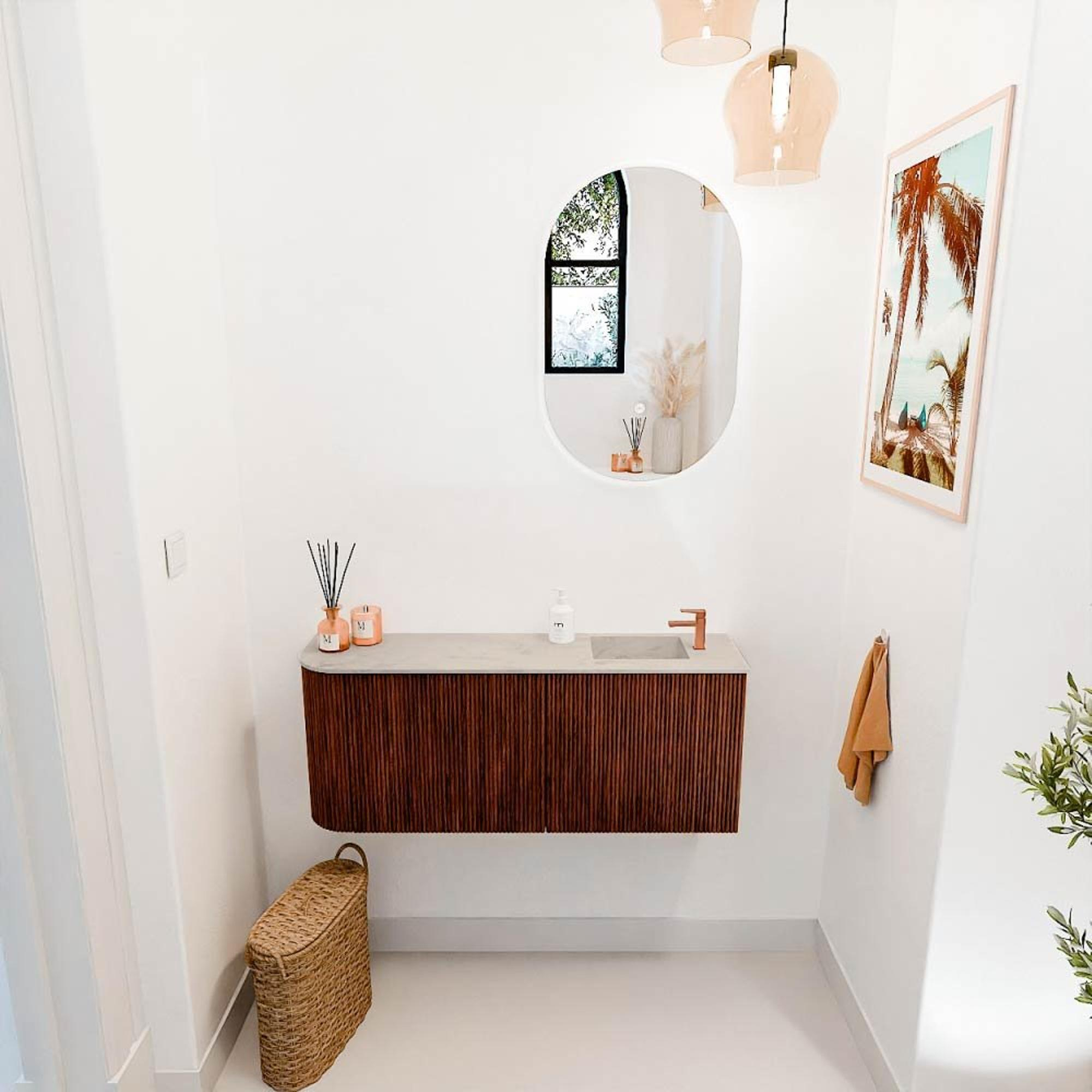 De combinatie van de warme Ruby kleur met het natuurlijke eikenhout geeft dit meubel een tijdloze en elegante uitstraling. De afgeronde vorm aan de linkerkant zorgt voor een speels en modern effect, waardoor het meubel een echte blikvanger wordt in jouw badkamer. Door de subtiele kleurcontrasten en het strakke design past het meubel moeiteloos in verschillende interieurstijlen, van klassiek tot eigentijds. Zo creëer je een badkamer die niet alleen praktisch is, maar ook uitnodigt om te ontspannen en te genieten.