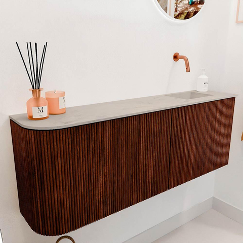 Met dit prachtige meubel geef je jouw badkamer direct een warme en stijlvolle uitstraling. Het combineert een eigentijds design met praktische functionaliteit, waardoor het niet alleen mooi oogt, maar ook perfect aansluit bij jouw dagelijkse routine. Dankzij de royale afmetingen en slimme indeling creëer je extra opbergruimte zonder dat het meubel te veel ruimte inneemt. De subtiele ronding aan de linkerkant geeft het geheel een speels en uniek karakter, terwijl de warme Ruby-kleur zorgt voor een sfeervolle en uitnodigende ambiance. De wastafel, met zijn strakke lijnen en zachte Opalo-kleur, past naadloos bij het meubel en maakt het geheel compleet. Zo geniet je elke dag van een badkamer die niet alleen functioneel is, maar ook een plek waar je je echt thuis voelt.