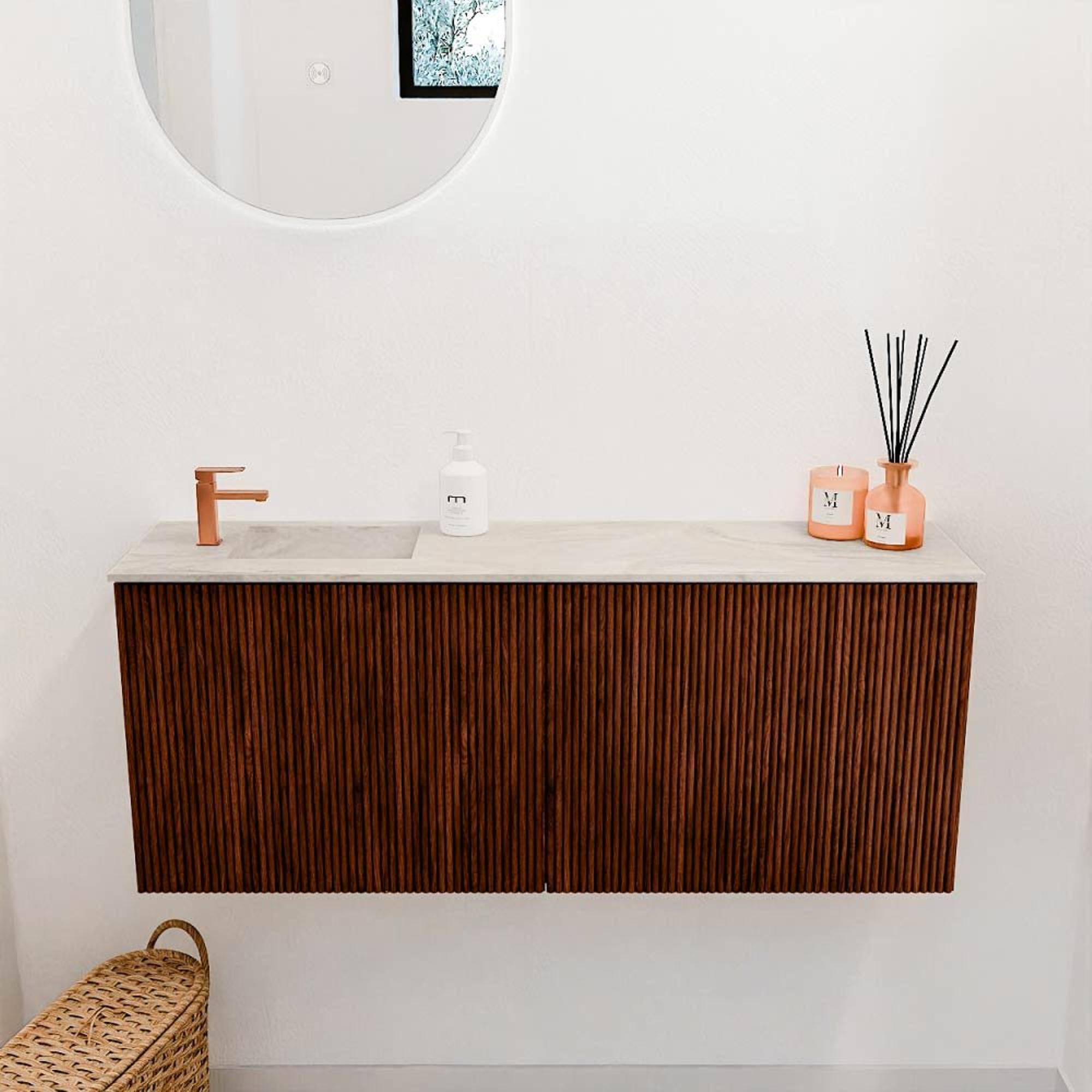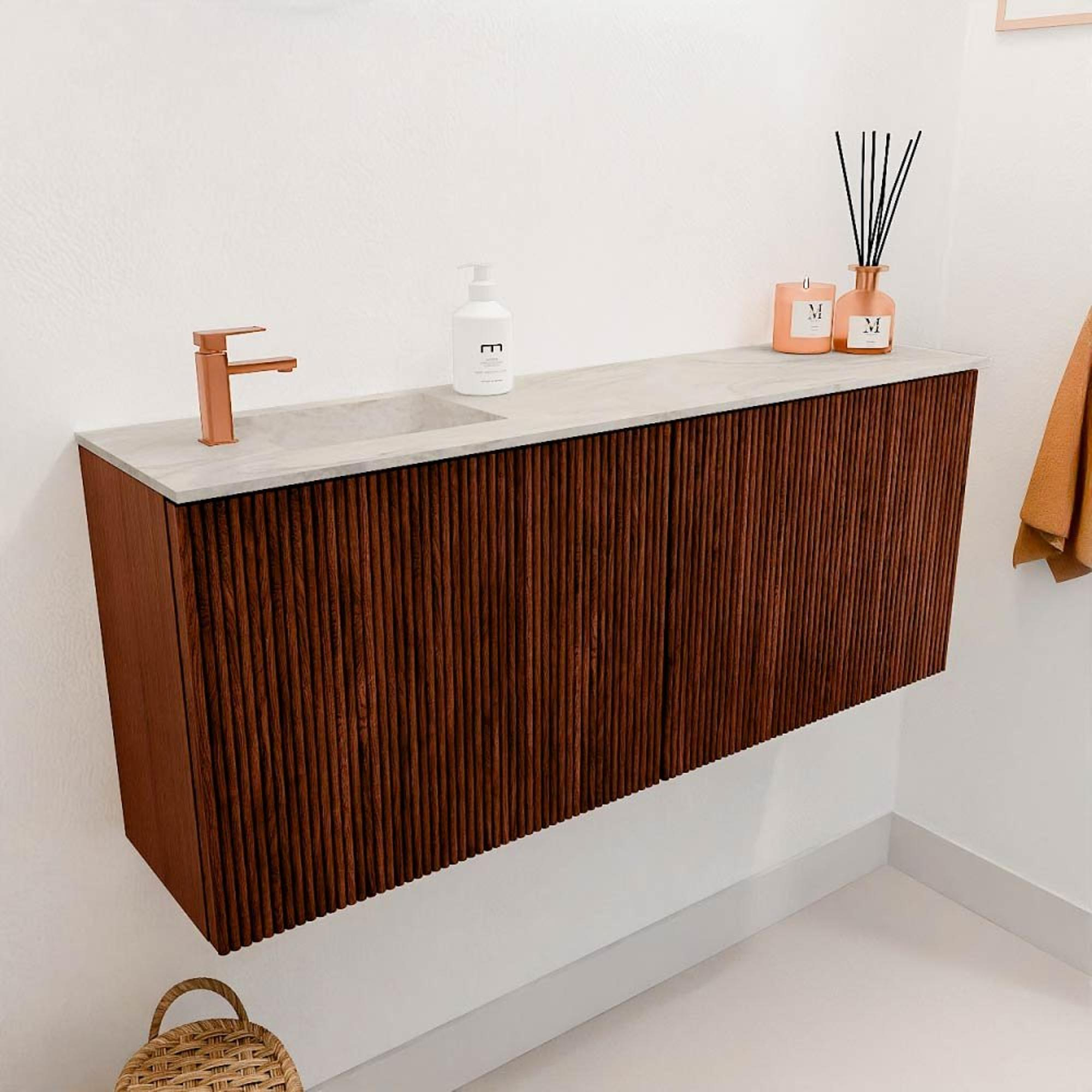 - Wastafelmodel FAYE in Ostra-kleur met links geplaatst kraangat voor optimale functionaliteit