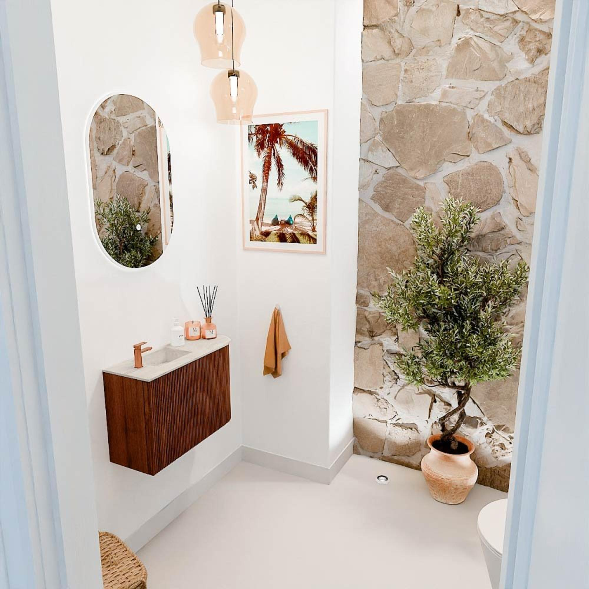 Met dit prachtige meubel geef je jouw gastentoilet direct een stijlvolle en warme uitstraling. De combinatie van de robuuste, natuurlijke materialen en de subtiele ronding aan de rechterzijde zorgt voor een uniek en uitnodigend design. Dankzij het compacte formaat van 61,6 cm breed past het meubel perfect in kleinere ruimtes, zonder in te leveren op functionaliteit. De wastafel met een kraangat aan de linkerkant in een zachte Ostra-kleur voegt een frisse en lichte touch toe, die prachtig contrasteert met de diepe Ruby-kleur van het meubel. Dit geheel maakt het mogelijk om jouw badkamer of gastentoilet een persoonlijke en hoogwaardige uitstraling te geven, waar je elke dag met plezier gebruik van zult maken.