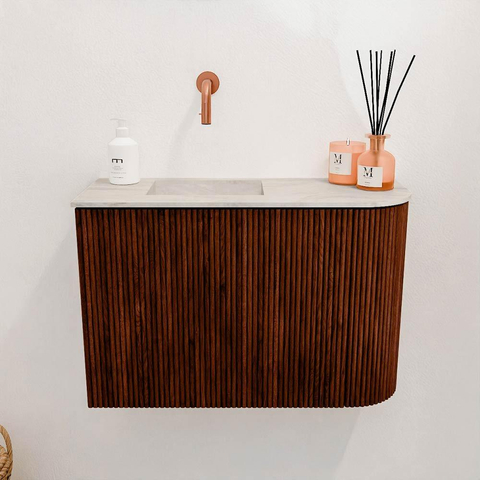 De warme Ruby-kleur van het meubel in combinatie met de lichte Ostra wastafel creëert een verfijnde en moderne look. Het meubel is afgewerkt met een houten front van massief eiken en zijpanelen met eikenfineer, wat zorgt voor een natuurlijke en luxe uitstraling. Deze subtiele mix van materialen en kleuren maakt het meubel een echte blikvanger in jouw badkamer of toilet. Bovendien zorgt de afgeronde rechterzijde voor een speels en uniek design dat zich moeiteloos aanpast aan de ruimte, zonder dat het meubel te dominant wordt.