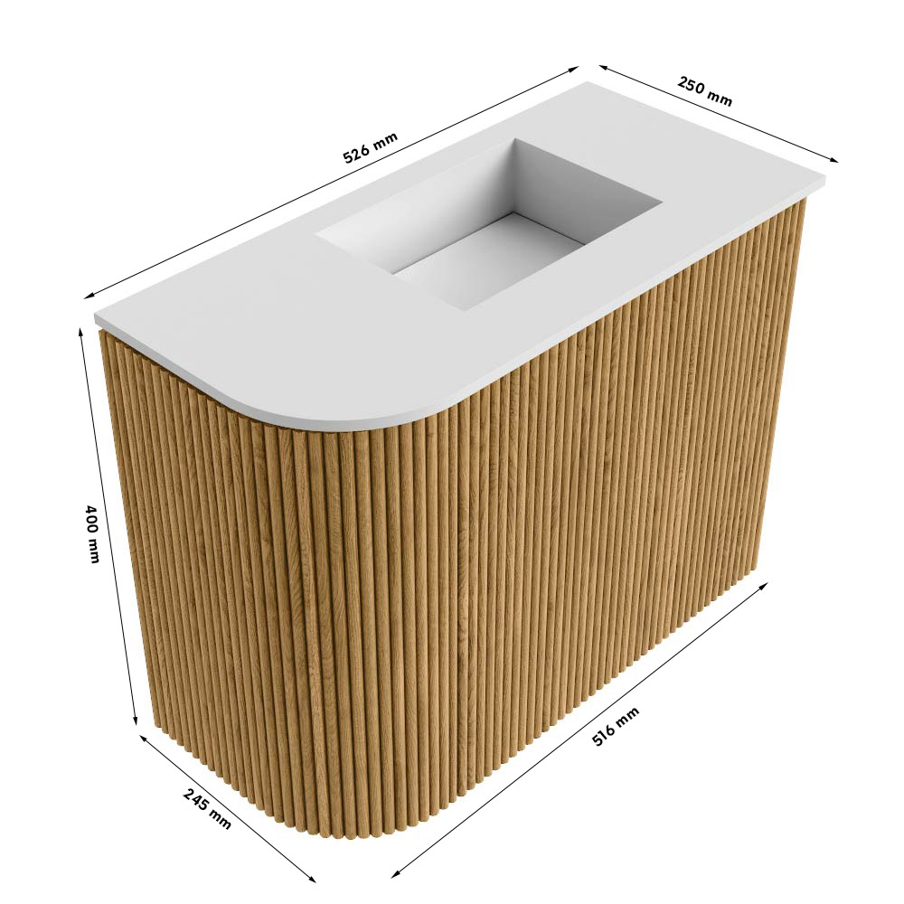 Met een breedte van 51,6 cm en een diepte van 24,5 cm biedt dit meubel voldoende opbergruimte voor al je badkamerbenodigdheden, terwijl het toch compact genoeg blijft voor kleinere badkamers. De wastafel is rechts gepositioneerd, wat zorgt voor een praktische indeling die het gebruiksgemak verhoogt. Doordat het meubel zonder kraangat geleverd wordt, kun je zelf kiezen welke kraan het beste bij jouw wensen en stijl past. De wandmontage zorgt voor een strakke afwerking en maakt het schoonmaken van de vloer eenvoudig en snel. Zo combineer je functionaliteit met een strak design.