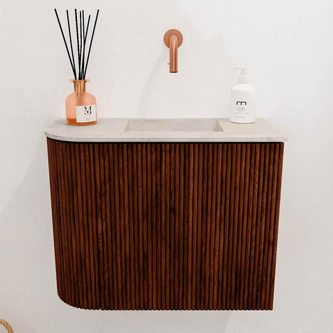 De opvallende Ruby-kleur geeft dit meubel een warme en uitnodigende uitstraling die direct in het oog springt. Door de ronde vorm aan de linkerkant krijgt het meubel een speels en modern karakter, wat het onderscheidt van standaard badkamermeubels. Dit zorgt niet alleen voor een visueel aantrekkelijke badkamer, maar ook voor een persoonlijke touch die jouw stijl weerspiegelt. De combinatie met de lichte Ostra wastafel zorgt voor een mooi contrast, waardoor het geheel fris en eigentijds oogt. Zo creëer je een badkamer die zowel stijlvol als tijdloos is.