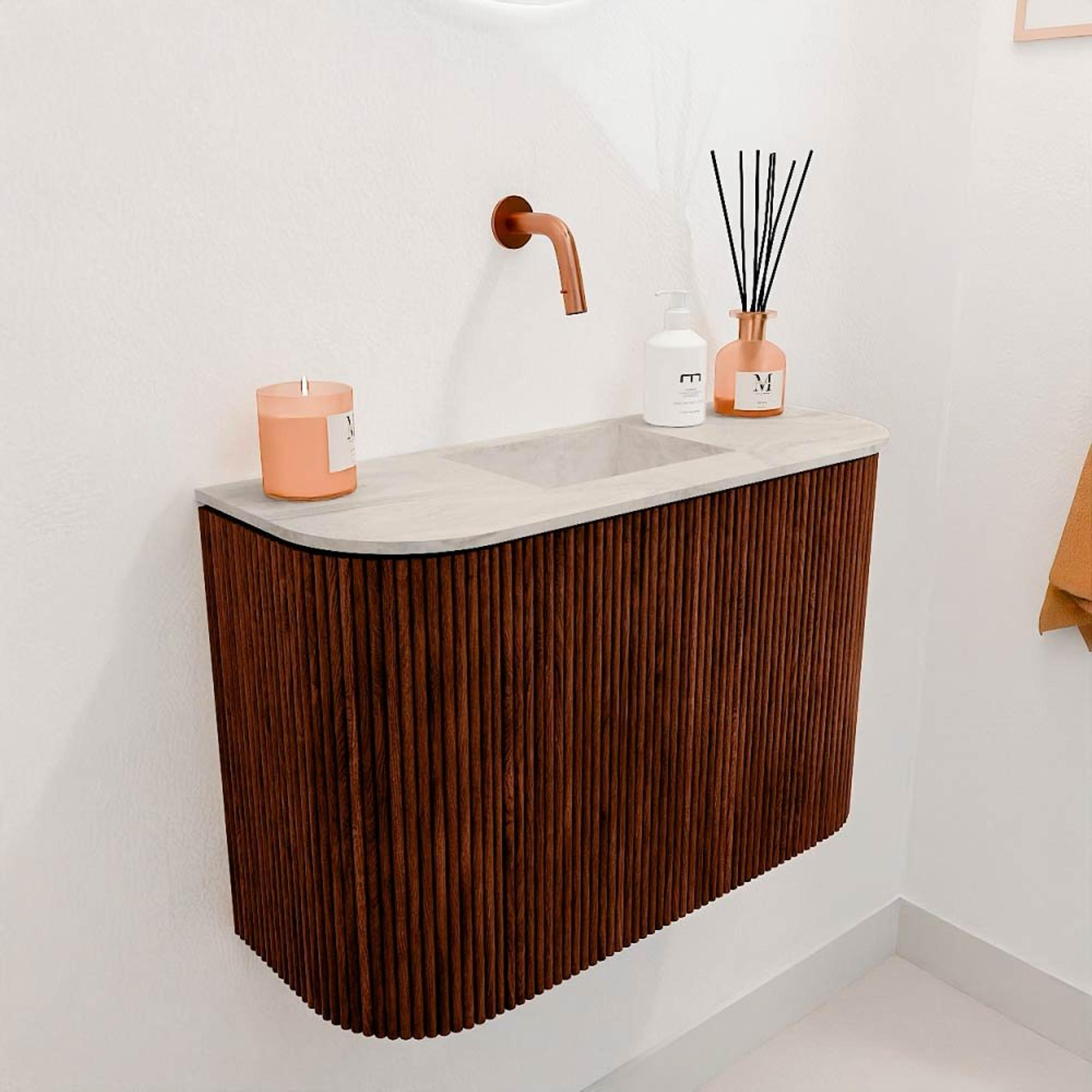 De warme Ruby kleur van het meubel in combinatie met de lichte Ostra wastafel zorgt voor een tijdloze en elegante uitstraling. De afgeronde hoeken aan beide zijden geven het geheel een zachte en moderne touch, waardoor het meubel zich moeiteloos aanpast aan verschillende badkamerstijlen. Door de hoogwaardige afwerking met eikenfineer straalt het meubel luxe en kwaliteit uit. Dit maakt het niet alleen een functioneel element, maar ook een echte blikvanger in jouw badkamer.