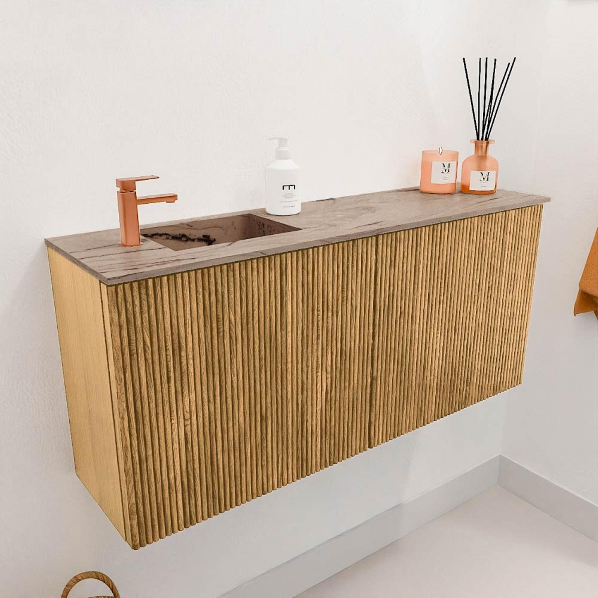 De warme eiken kleur en het subtiele verticale groefpatroon geven dit meubel een tijdloze en natuurlijke uitstraling. Het design is zorgvuldig vormgegeven met aandacht voor detail, waardoor het een luxe sfeer toevoegt aan je badkamer. De combinatie van het hout en de strakke lijnen zorgt voor een harmonieus geheel dat moeiteloos aansluit bij verschillende interieurstijlen. Of je nu kiest voor een moderne, landelijke of klassieke badkamer, dit meubel past perfect en verhoogt direct de uitstraling van je ruimte.