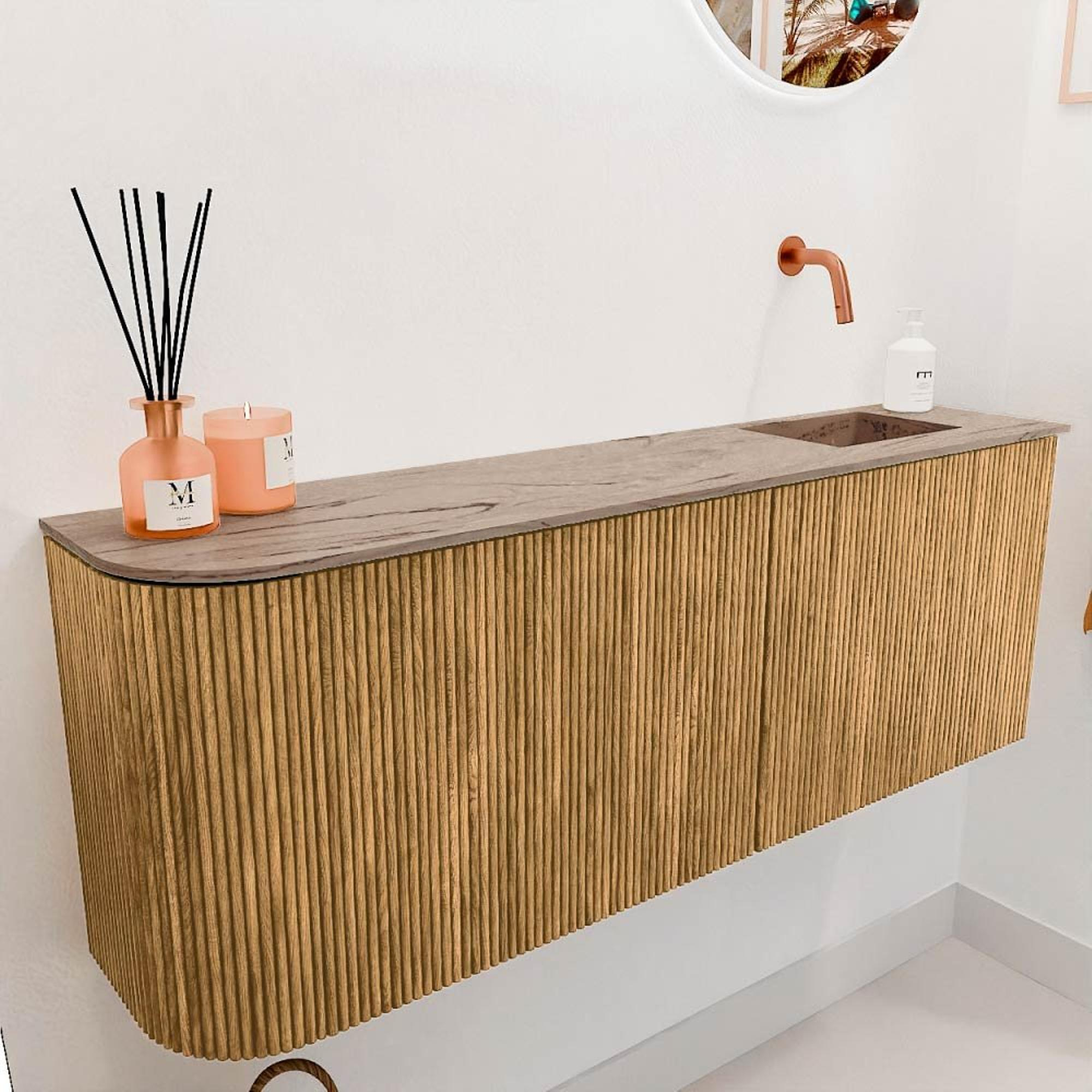 De combinatie van het warme eikenhout met de subtiele ronding aan de linkerkant maakt dit meubel een echte blikvanger. De verticale groeven in het hout zorgen voor een verfijnde textuur die het meubel een luxe uitstraling geeft zonder te overheersen. Dankzij het doordachte ontwerp past het meubel perfect in zowel moderne als klassieke badkamers. Je profiteert van een tijdloos design dat moeiteloos aansluit bij verschillende interieurstijlen, waardoor je badkamer altijd up-to-date blijft. Bovendien zorgt de arena-kleur van de wastafel voor een frisse en lichte uitstraling, die het geheel een open en ruimtelijk gevoel geeft.