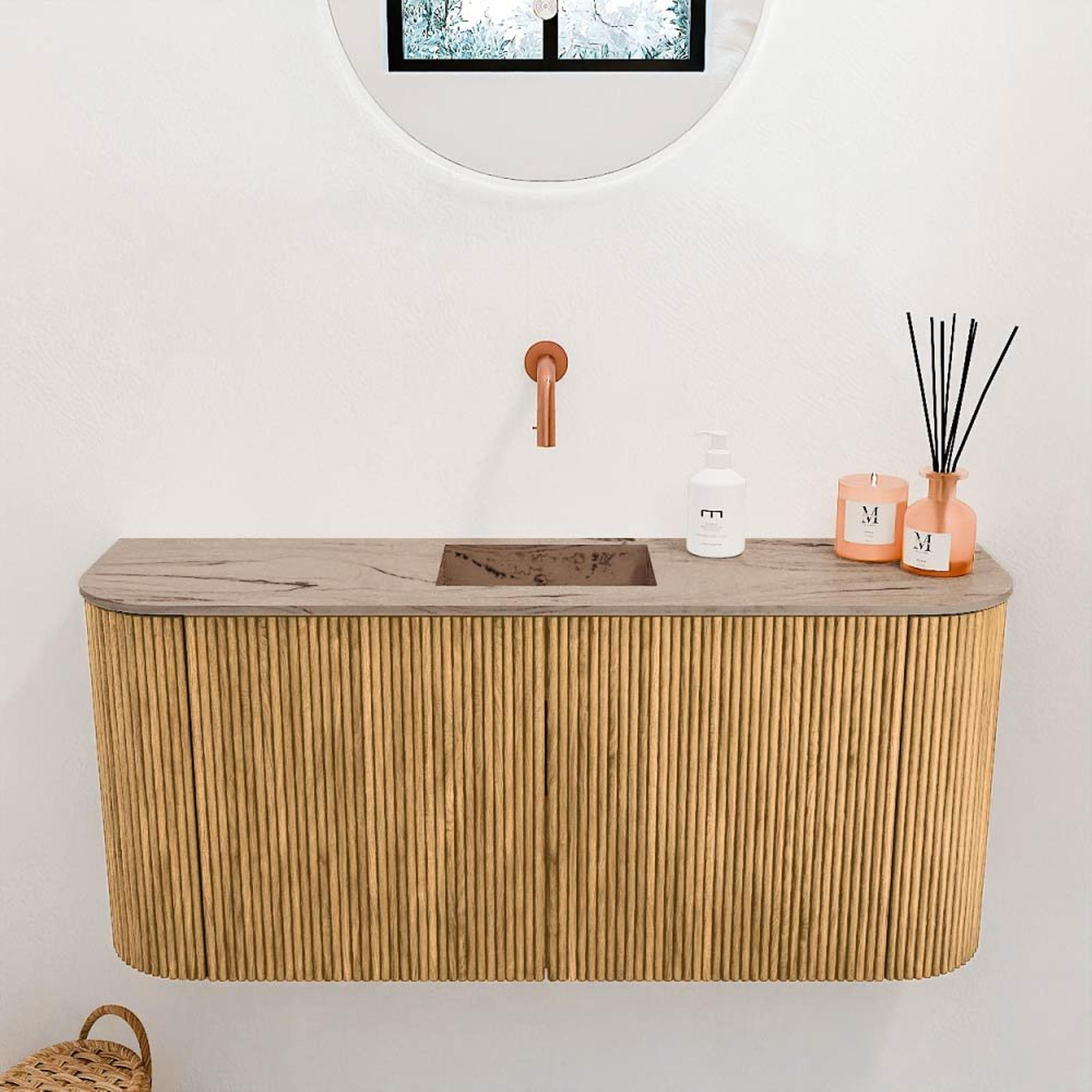 Het meubel valt direct op door zijn elegante rondingen aan zowel links als rechts, die het ontwerp een speels en toch verfijnd karakter geven. De warme eikenhouten kleur voegt een natuurlijke charme toe die moeiteloos aansluit bij diverse interieurstijlen, van modern tot klassiek. Door de subtiele afwerking en het doordachte design wordt jouw badkamer een plek waar stijl en comfort samenkomen. Dit stijlvolle meubel maakt van jouw badkamer een echte eyecatcher, zonder te overheersen.