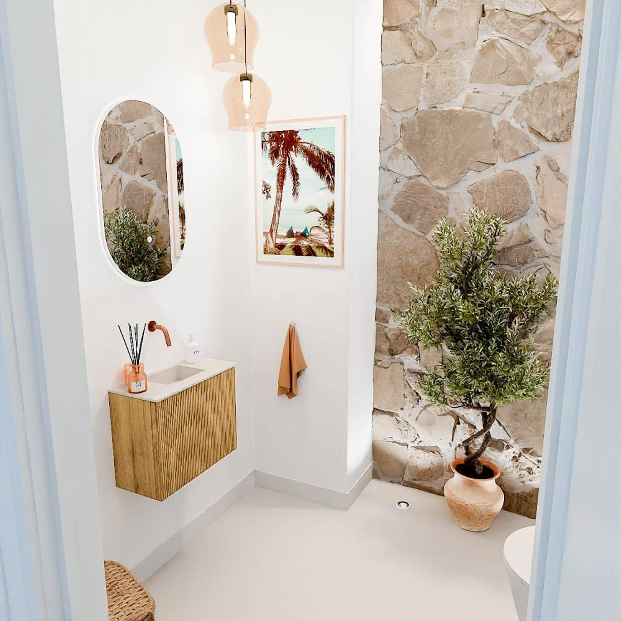De keuze voor massief eikenhout garandeert een lange levensduur en robuustheid. Dit meubel is bestand tegen de dagelijkse vochtigheid en intensief gebruik in de badkamer. Het eiken fineer aan de zijkanten zorgt voor een natuurlijke uitstraling zonder in te leveren op stevigheid. Door te investeren in kwaliteit ben je verzekerd van een meubel dat jarenlang meegaat en zijn charme behoudt. Zo combineer je duurzaamheid met een tijdloos design, wat ook nog eens goed is voor het milieu.