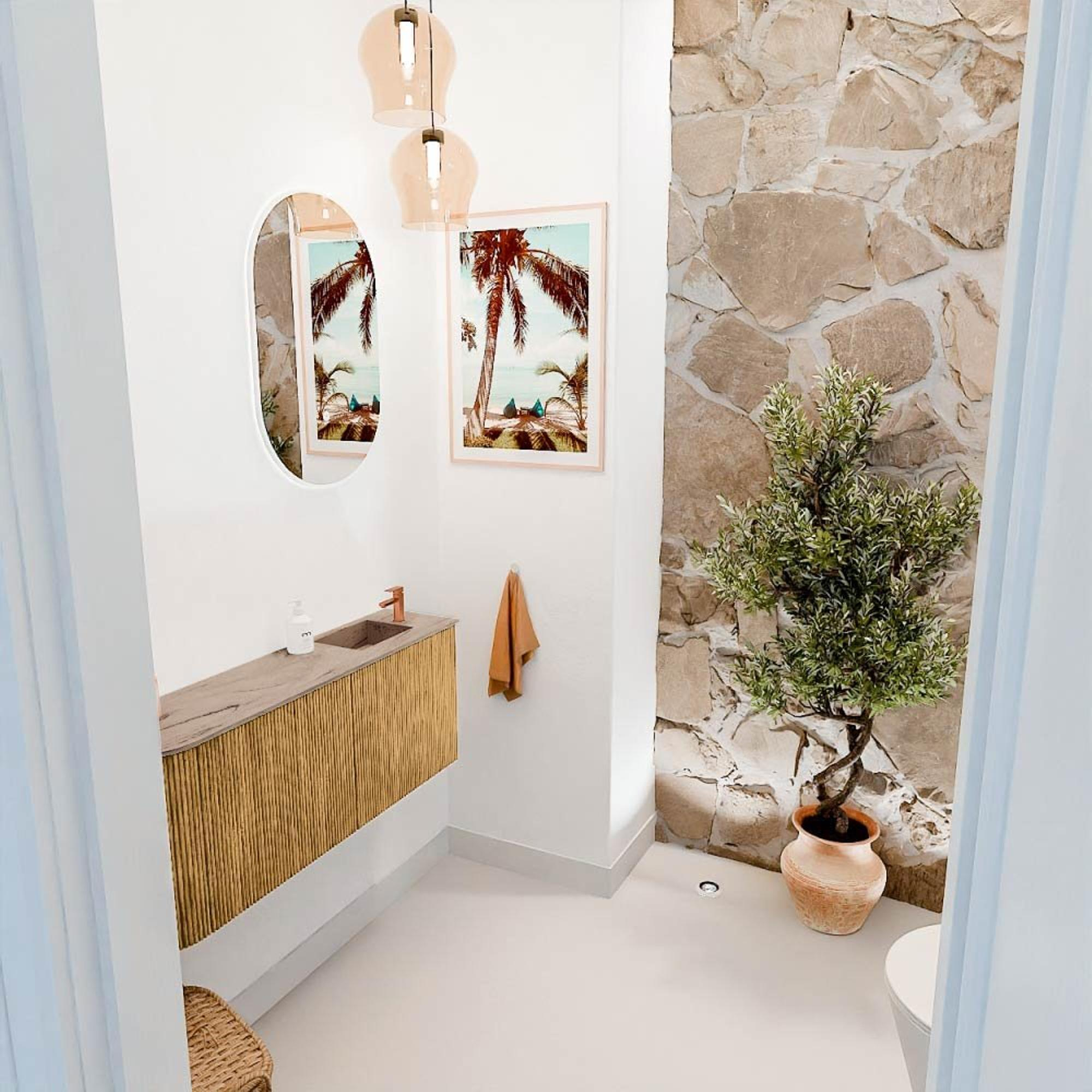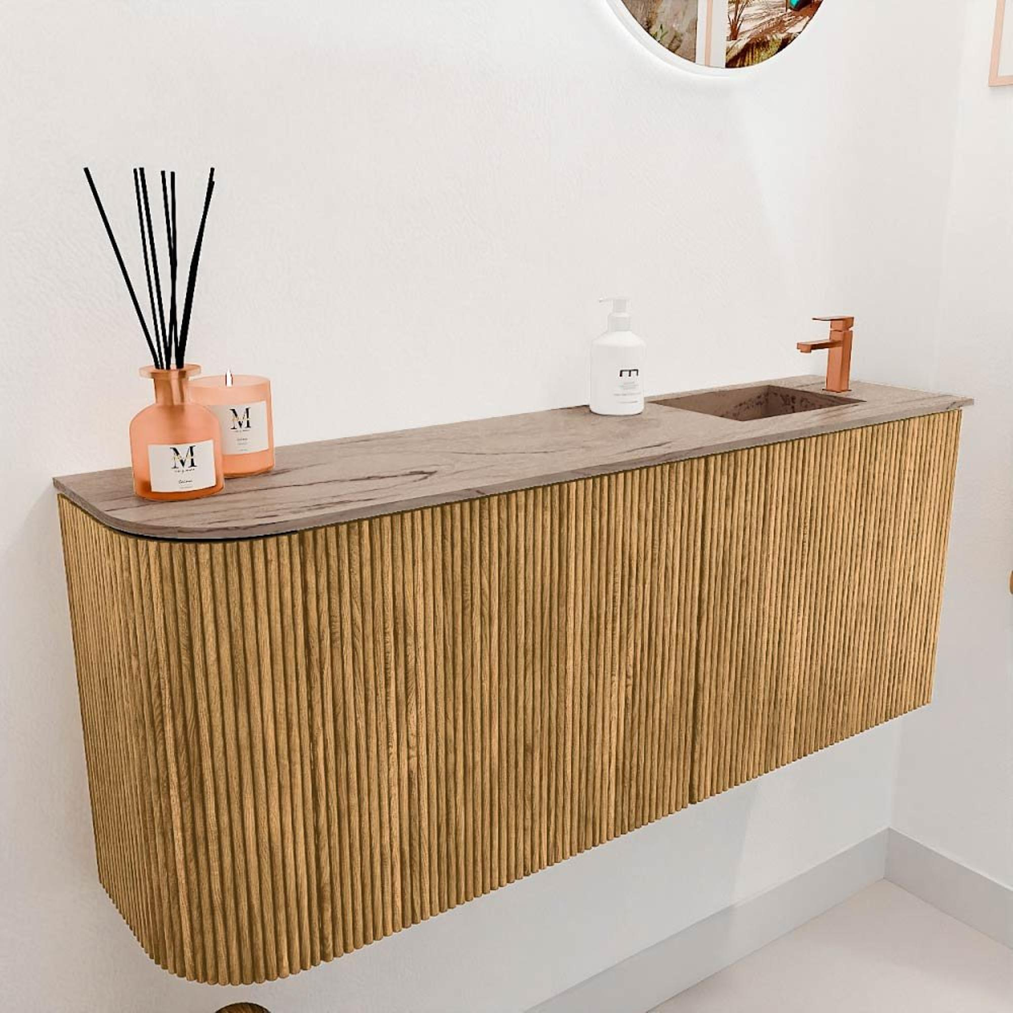 De warme eikenkleur en het natuurlijke houtpatroon geven dit meubel een tijdloze elegantie die moeiteloos past in zowel klassieke als moderne badkamers. De afgeronde linkerzijde voegt een uniek detail toe dat het ontwerp onderscheidt van standaard meubels. Hierdoor creëer je een sfeervolle en uitnodigende ambiance die jouw badkamer een persoonlijke touch geeft. De wastafel in Arena-kleur sluit hier naadloos op aan en zorgt voor een harmonieuze uitstraling. Zo geniet je van een badkamer die niet alleen functioneel is, maar ook echt inspireert.
