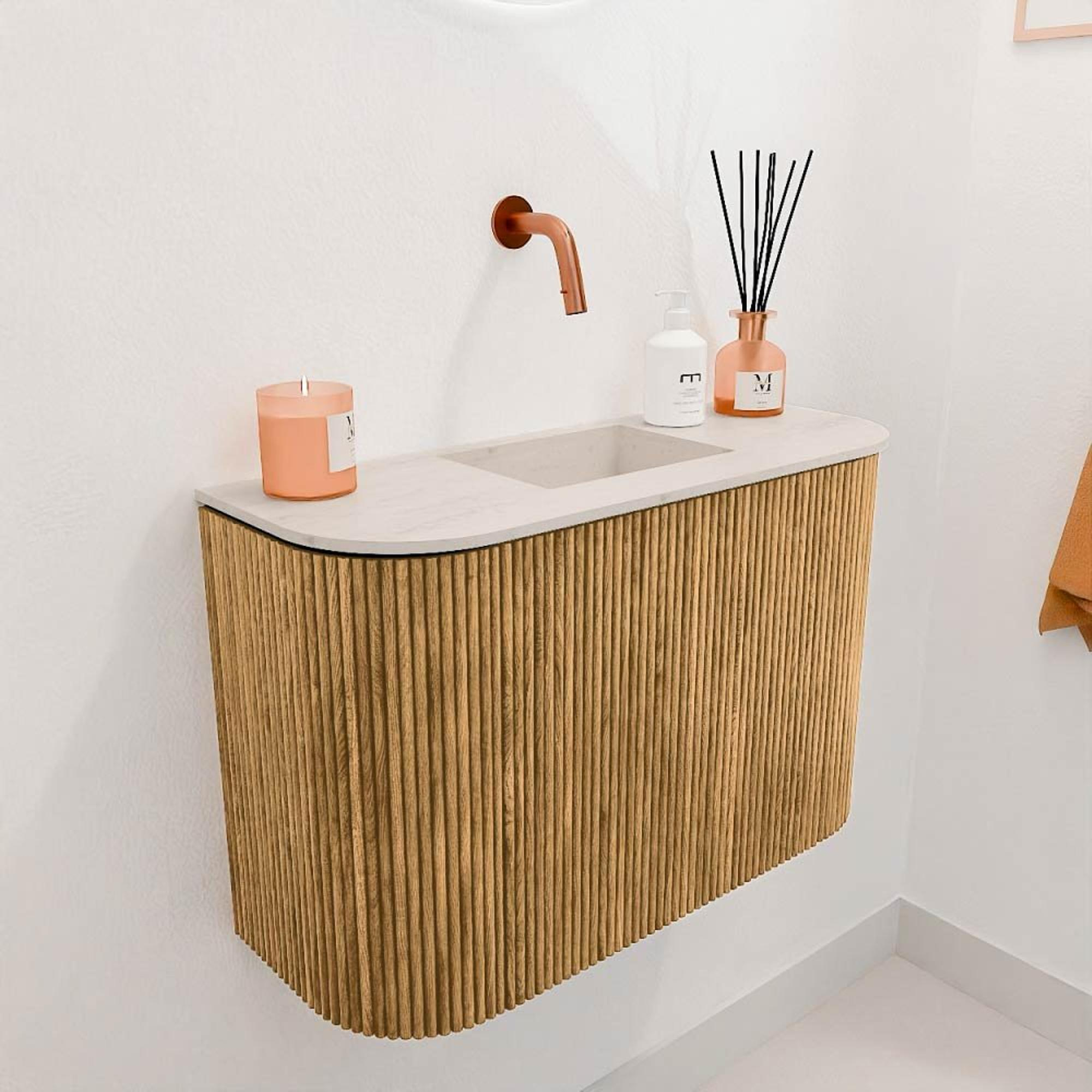 Met dit prachtige meubel geef je jouw badkamer direct een warme en natuurlijke uitstraling. Het compacte ontwerp met een breedte van 63,2 cm past perfect in kleinere ruimtes zonder in te leveren op stijl of functionaliteit. De subtiele rondingen aan zowel de linker- als rechterzijde zorgen voor een zachte, uitnodigende vorm die het geheel een eigentijdse en verfijnde uitstraling geeft. Dankzij de combinatie van massief eikenhout aan de voorkant en eikenfineer aan de zijkanten geniet je van een duurzaam en kwalitatief hoogwaardig meubel dat jarenlang meegaat. De wastafel, centraal geplaatst en uitgevoerd zonder kraangat, biedt je de vrijheid om zelf een kraan te kiezen die bij jouw wensen past. Zo creëer je een badkamer die niet alleen mooi oogt, maar ook perfect aansluit op jouw persoonlijke stijl en gebruiksgemak.