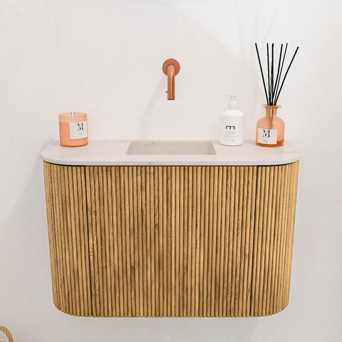 - Kleur: warme eikenhoutkleur voor het meubel, wastafel in Meli (grijstint) – stijlvol en tijdloos