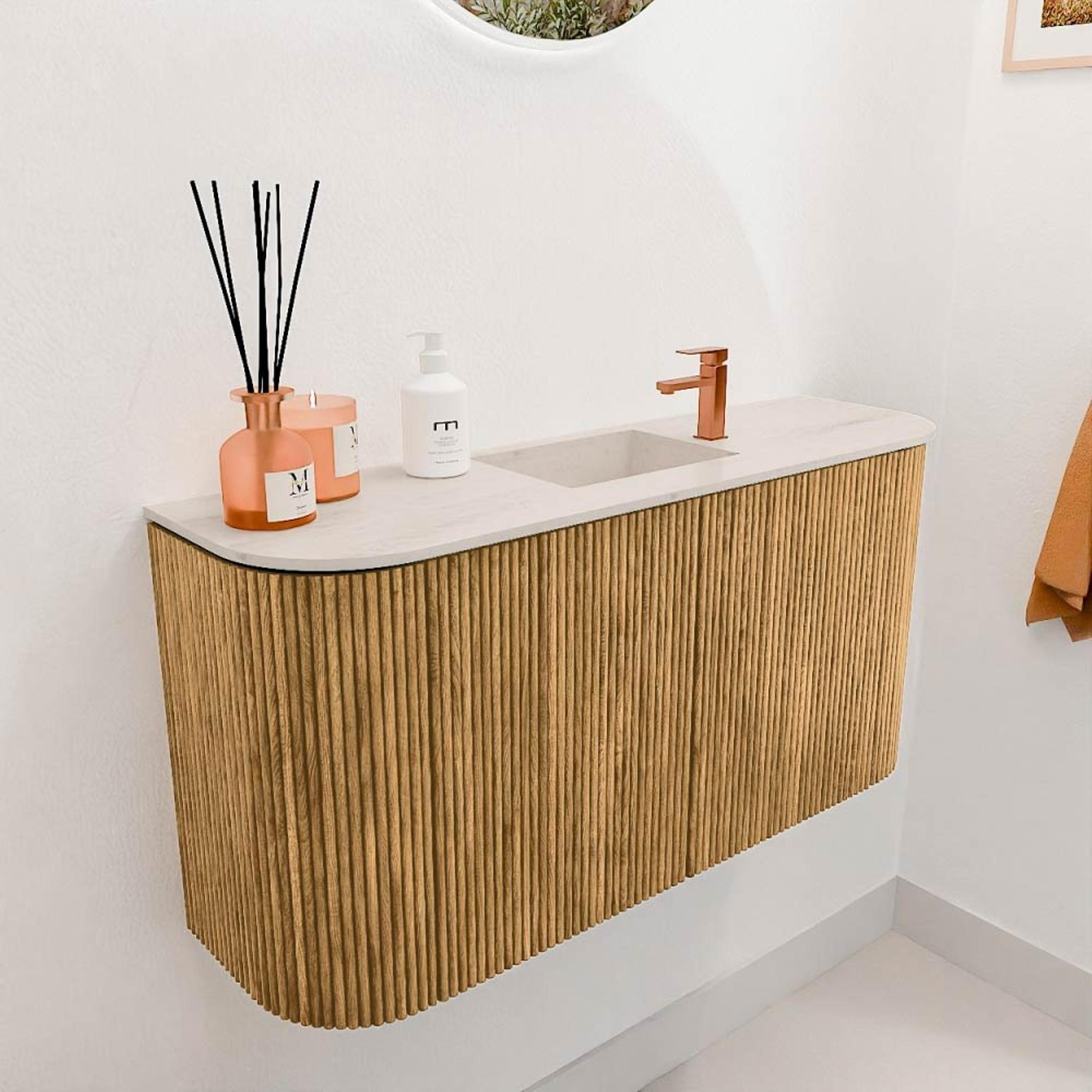 De elegante rondingen aan beide zijden geven het meubel een unieke en zachte uitstraling die direct opvalt. De verticale groeven in het eikenhout zorgen voor een subtiel, maar karaktervol detail dat de natuurlijke houtstructuur benadrukt. Door de warme kleur Meli van het eikenhout ontstaat een sfeervolle ambiance die perfect aansluit bij diverse interieurstijlen, van modern tot klassiek. Dit meubel is een echte blikvanger die jouw badkamer een exclusieve uitstraling geeft zonder te overheersen.