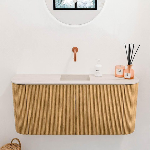 Het meubel valt direct op door zijn moderne, afgeronde vormen aan beide zijden die zorgen voor een zachte en uitnodigende uitstraling. De warme eiken kleur voegt een natuurlijke touch toe die moeiteloos aansluit bij diverse badkamerstijlen, van klassiek tot eigentijds. Dankzij het doordachte ontwerp met een wastafel die centraal is geplaatst, oogt het geheel rustig en evenwichtig. Dit stijlvolle meubel maakt jouw badkamer niet alleen mooier, maar ook een plek waar je je echt thuis voelt.