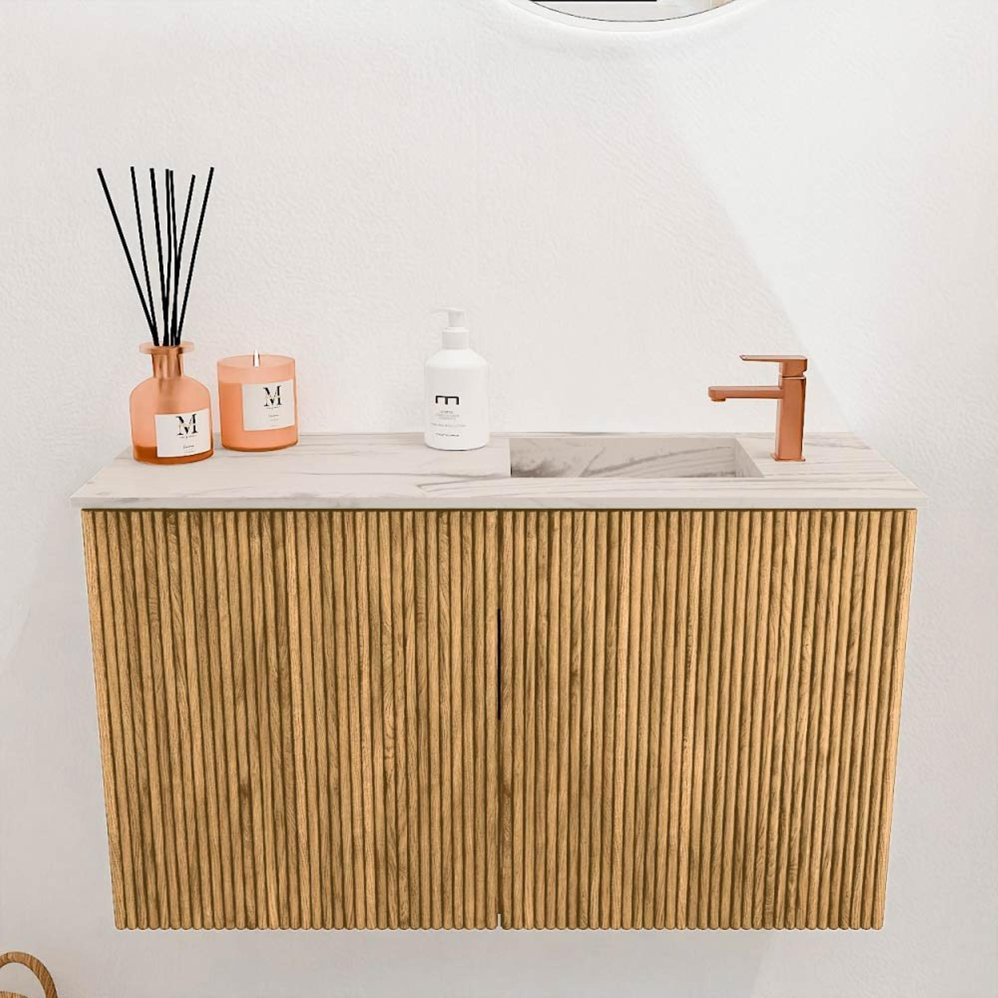 Het meubel valt direct op door het gebruik van massief eikenhout, dat niet alleen duurzaam is maar ook een natuurlijke warmte uitstraalt. De verticale groeven in het hout zorgen voor een subtiel, maar onderscheidend design dat moeiteloos past in zowel moderne als klassieke badkamers. Door de combinatie van eikenhout en de zachte nata kleur van de wastafel ontstaat een harmonieus geheel dat jouw badkamer een luxe uitstraling geeft. Zo creëer je een ruimte die niet alleen functioneel is, maar ook echt uitnodigt om te ontspannen.