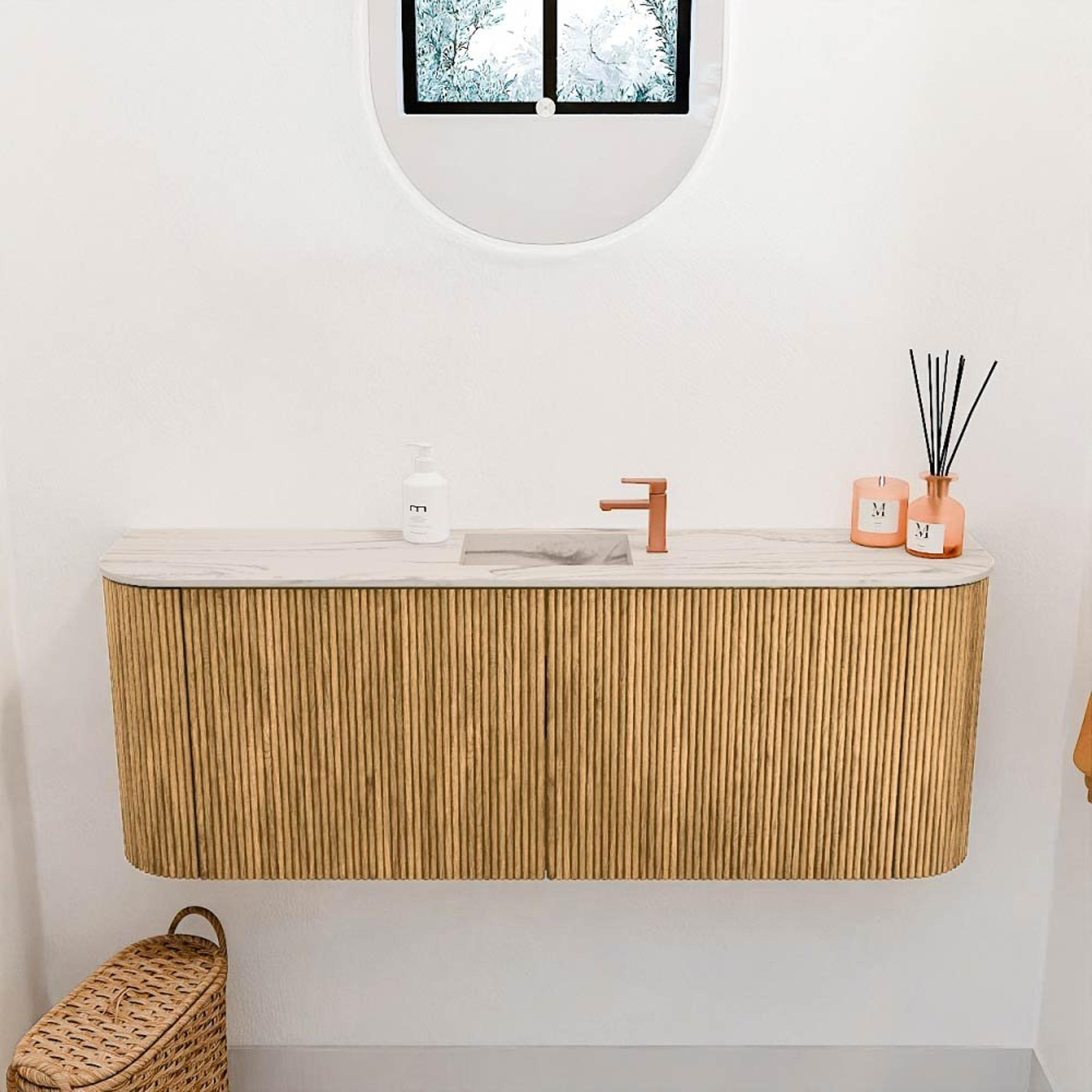 De combinatie van massief eikenhout en fineer in een warme oak kleur geeft dit meubel een natuurlijke en luxe uitstraling. De subtiele rondingen aan beide zijden zorgen voor een zacht en uitnodigend design dat direct de aandacht trekt. Dit stijlvolle meubel past perfect in diverse interieurstijlen en voegt een warme, authentieke sfeer toe aan jouw badkamer. Door de centrale positie van de wastafel en het strakke ontwerp blijft het geheel rustig en overzichtelijk, wat bijdraagt aan een ontspannen badkamerbeleving.