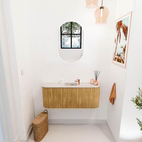 De combinatie van massief eikenhout met verticale ribbeldetails geeft dit meubel een luxe en natuurlijke uitstraling. Het warme Oak-kleurige hout past perfect in diverse interieurstijlen, van modern tot klassiek. Door de subtiele rondingen aan beide kanten oogt het meubel zacht en uitnodigend, wat bijdraagt aan een prettige sfeer in je badkamer. Zo creëer je een stijlvolle ruimte waar je elke dag met plezier begint.