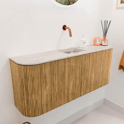 De natuurlijke eikenhouten afwerking met een warme nata-kleur geeft jouw badkamer een authentieke en luxe uitstraling. De ronde vormen aan beide kanten zorgen voor een zachte, uitnodigende look die het meubel onderscheidt van standaard badkamermeubels. Door het strakke, maar toch organische design past het meubel moeiteloos in diverse interieurstijlen, van modern tot landelijk. Zo geniet je niet alleen van een functioneel meubel, maar ook van een echte blikvanger die jouw badkamer een unieke sfeer geeft.