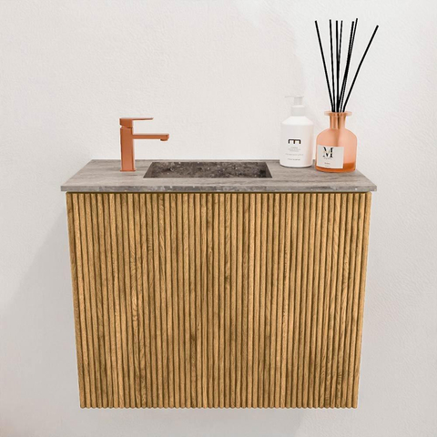 Het meubel valt direct op door het natuurlijke eikenhout en de verfijnde verticale ribbelstructuur. Deze details geven het een exclusieve uitstraling die zowel modern als tijdloos is. Door de warme houttinten voelt jouw badkamer meteen uitnodigend en sfeervol aan. Het design is zorgvuldig vormgegeven zodat het niet alleen mooi oogt, maar ook perfect past in kleinere badkamers of toiletruimtes. Zo geniet je van een stijlvol meubel dat jouw badkamer een unieke identiteit geeft.