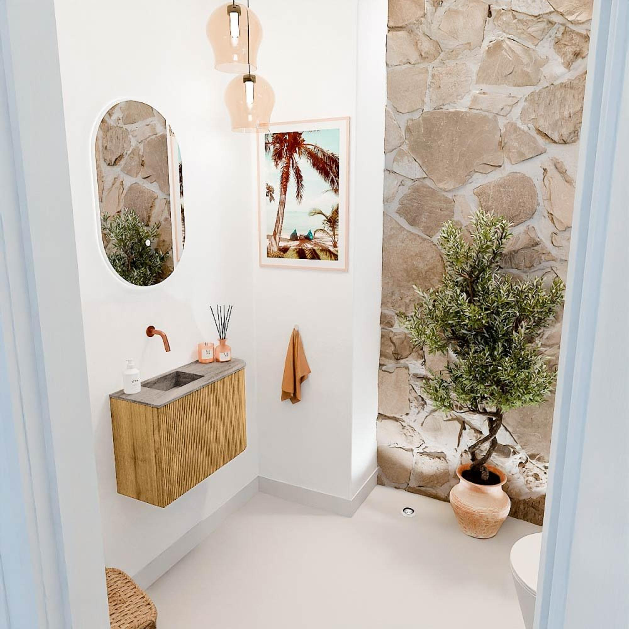 De combinatie van massief eikenhout en eikenfineer geeft dit meubel een natuurlijke en luxe uitstraling die moeiteloos in diverse interieurstijlen past. De verticale ribbels op de fronten zorgen voor een subtiel speels effect, waardoor het meubel een tijdloze elegantie uitstraalt. Door de afgeronde rechterzijde krijgt het meubel een zachte, uitnodigende vorm die het geheel net dat beetje extra karakter geeft. Zo haal je een stijlvol element in huis dat niet alleen functioneel is, maar ook een echte blikvanger in je badkamer vormt.