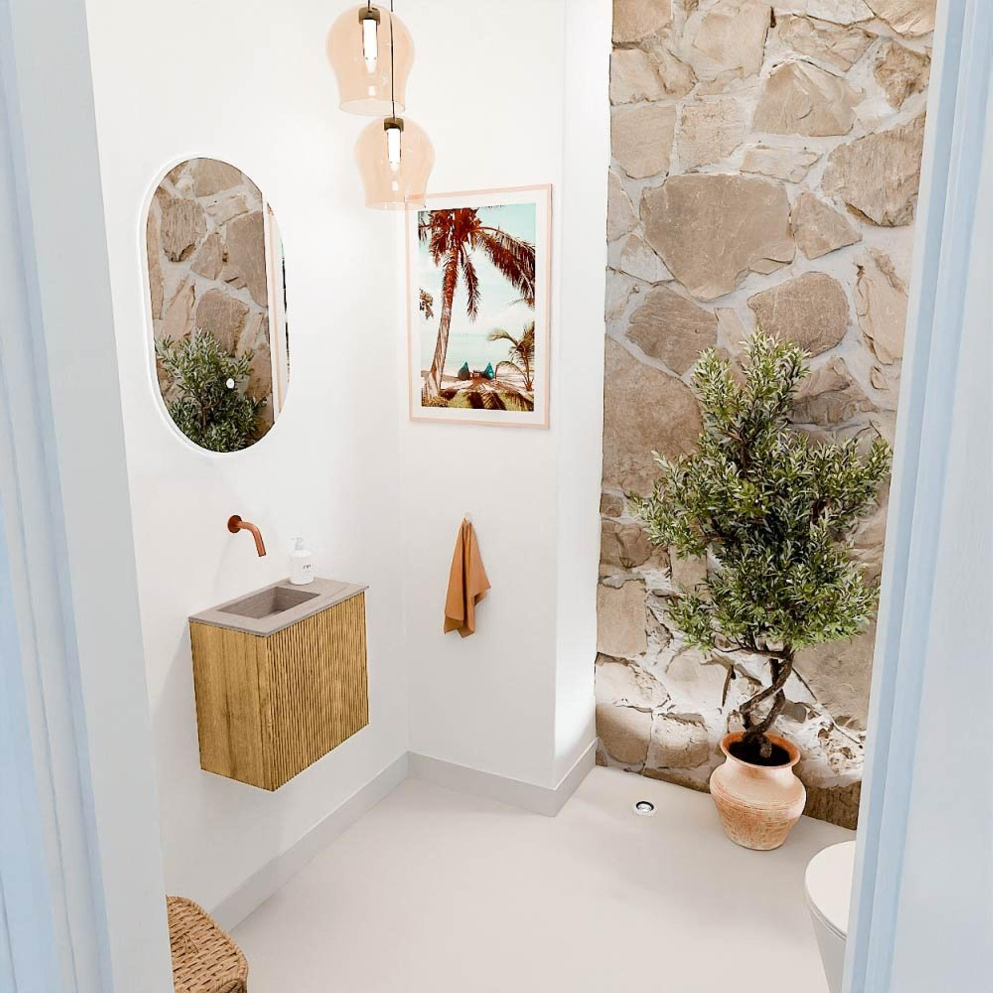 Met dit compacte meubel geef je jouw toilet of kleine badkamer direct een stijlvolle en warme uitstraling. Het natuurlijke eikenhout zorgt voor een tijdloze sfeer die je ruimte uitnodigend en verzorgd maakt. Dankzij het slimme ontwerp met een wastafel aan de linkerkant benut je iedere centimeter optimaal, zonder in te leveren op comfort of gebruiksgemak. De verticale ribbels op het front geven het meubel een eigentijdse twist, waardoor het niet alleen praktisch is, maar ook een echte blikvanger in je interieur. Dit meubel is ideaal voor wie houdt van kwaliteit en design, en zijn badkamer wil transformeren tot een plek waar je elke dag met plezier begint.