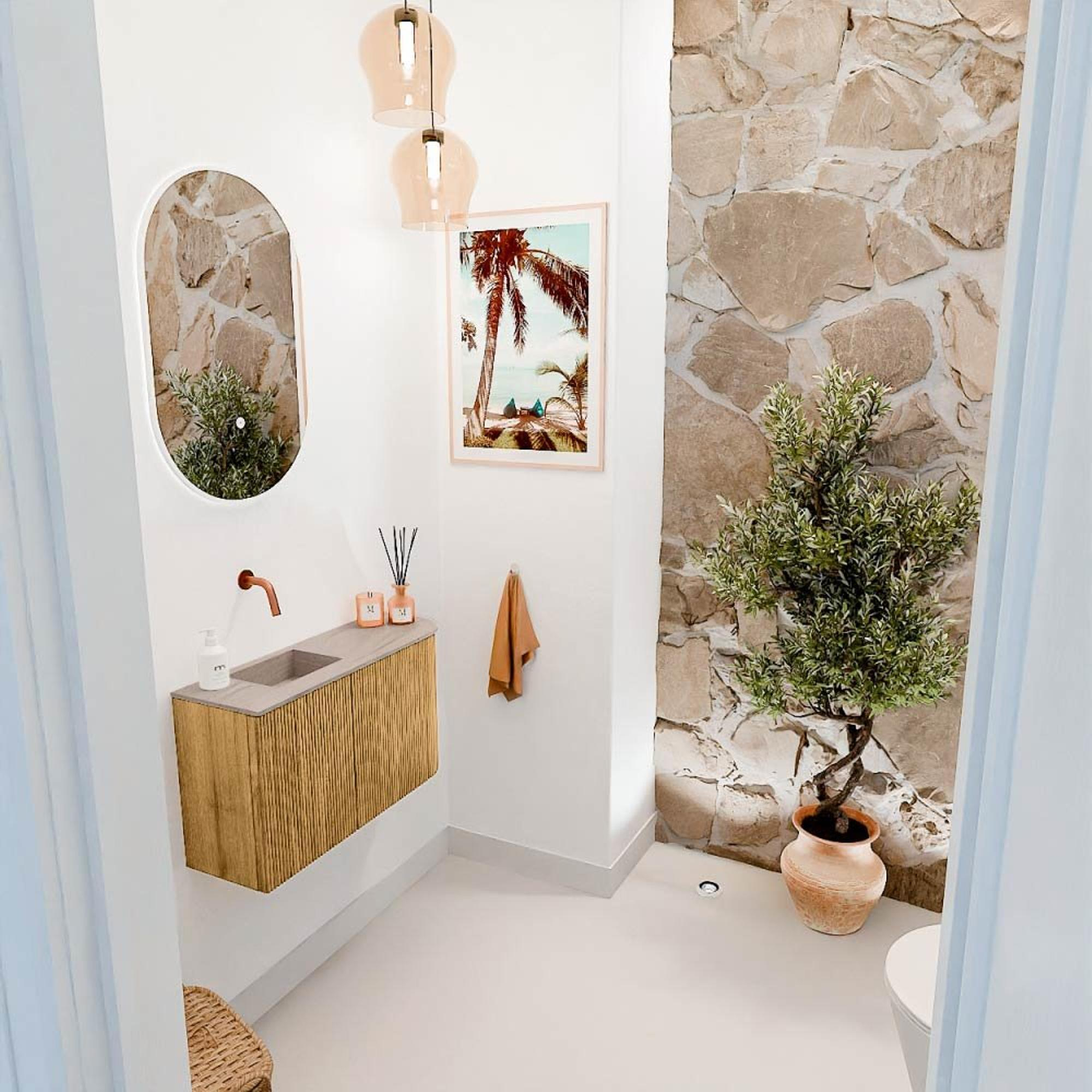 Met dit prachtige meubel geef je jouw badkamer direct een warme en natuurlijke uitstraling. Het combineert een verfijnde, moderne vormgeving met de tijdloze charme van eikenhout, waardoor het een echte blikvanger wordt in elke ruimte. Dankzij de slimme indeling en het compacte formaat van 71,6 cm breed past het perfect in kleinere badkamers of toiletruimtes zonder in te leveren op stijl of functionaliteit. De subtiele ronding aan de rechterkant zorgt voor een zachte, uitnodigende uitstraling en maakt het meubel bijzonder praktisch in gebruik. De wastafel, met zijn elegante Faye-design en links geplaatste positie, sluit naadloos aan bij het meubel en biedt voldoende ruimte om je dagelijkse rituelen comfortabel uit te voeren. Zonder kraangat kun je zelf kiezen voor een kraan die helemaal bij jouw wensen past. Zo creëer je een badkamer die niet alleen mooi oogt, maar ook perfect aansluit bij jouw persoonlijke stijl en behoeften.