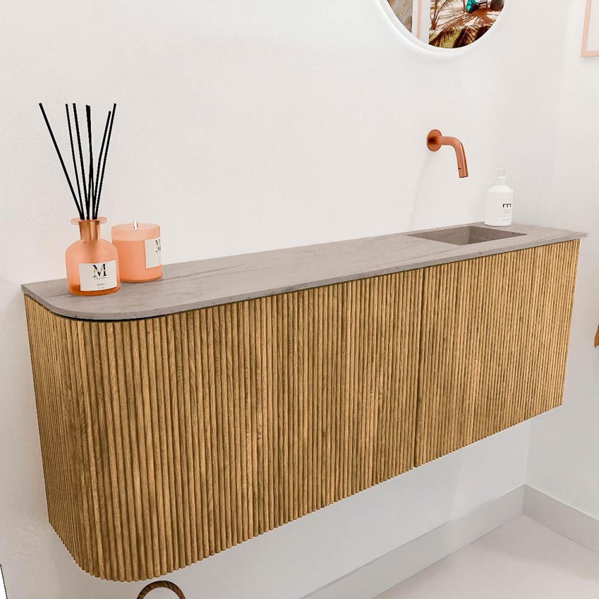 Met dit prachtige meubel geef je jouw toilet of compacte badkamer direct een warme en natuurlijke uitstraling. Het combineert de tijdloze charme van eikenhout met een modern, strak design dat perfect aansluit bij diverse interieurstijlen. Dankzij de subtiele ronding aan de linkerkant krijgt het meubel een unieke en elegante vorm, die niet alleen mooi oogt, maar ook praktisch is in kleinere ruimtes. De geïntegreerde wastafel van het model Faye, met de kraanpositie rechts maar zonder voorgeboord kraangat, biedt je de vrijheid om zelf de kraan te kiezen die het beste bij jouw wensen past. Dit meubel brengt rust en balans in je ruimte, terwijl het tegelijkertijd functioneel en duurzaam is. Zo geniet je dagelijks van een verzorgde en sfeervolle omgeving die jouw toilet of badkamer echt afmaakt.