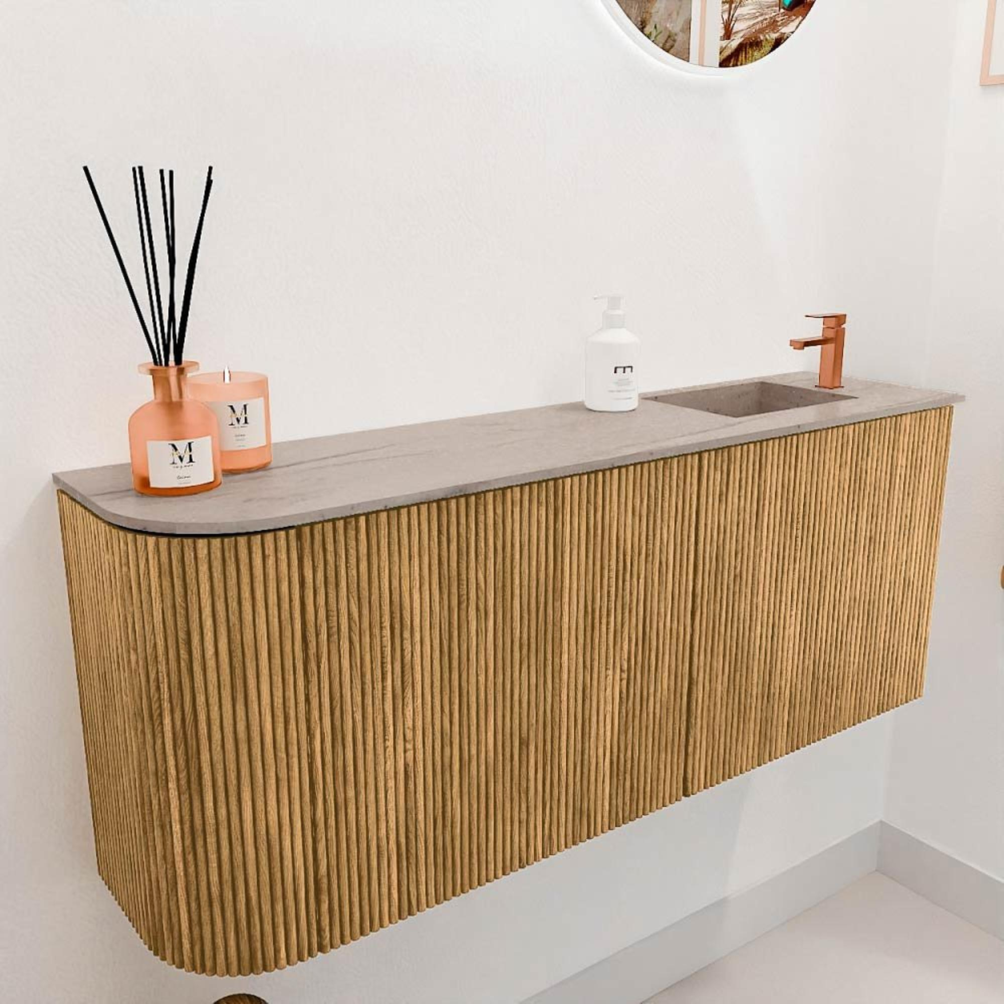 Dit meubel valt direct op door zijn elegante design en de warme eikenafwerking. De ronde vorm aan de linkerkant geeft het een unieke uitstraling die anders is dan standaard rechte meubels. Hierdoor voeg je een speels accent toe aan je badkamer of toilet, zonder dat het te opvallend wordt. De combinatie van massief eikenhout aan de voorkant en eikenfineer aan de zijkanten zorgt voor een natuurlijke en hoogwaardige uitstraling. Zo geniet je van een meubel dat niet alleen mooi is, maar ook perfect past bij een moderne en sfeervolle inrichting.