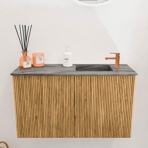 Het meubel valt direct op door de warme eiken kleur en de combinatie van massief eiken fronten met eiken fineer zijkanten. Dit geeft het geheel een natuurlijke en luxe uitstraling die naadloos aansluit bij diverse interieurstijlen. De wastafel in de kleur Sombra zorgt voor een subtiel contrast en een moderne uitstraling. Door de rechte positie van de wastafel met één kraangat blijft het design strak en overzichtelijk, wat bijdraagt aan een rustige sfeer in je badkamer. Zo haal je een tijdloos en elegant meubel in huis dat jarenlang meegaat.