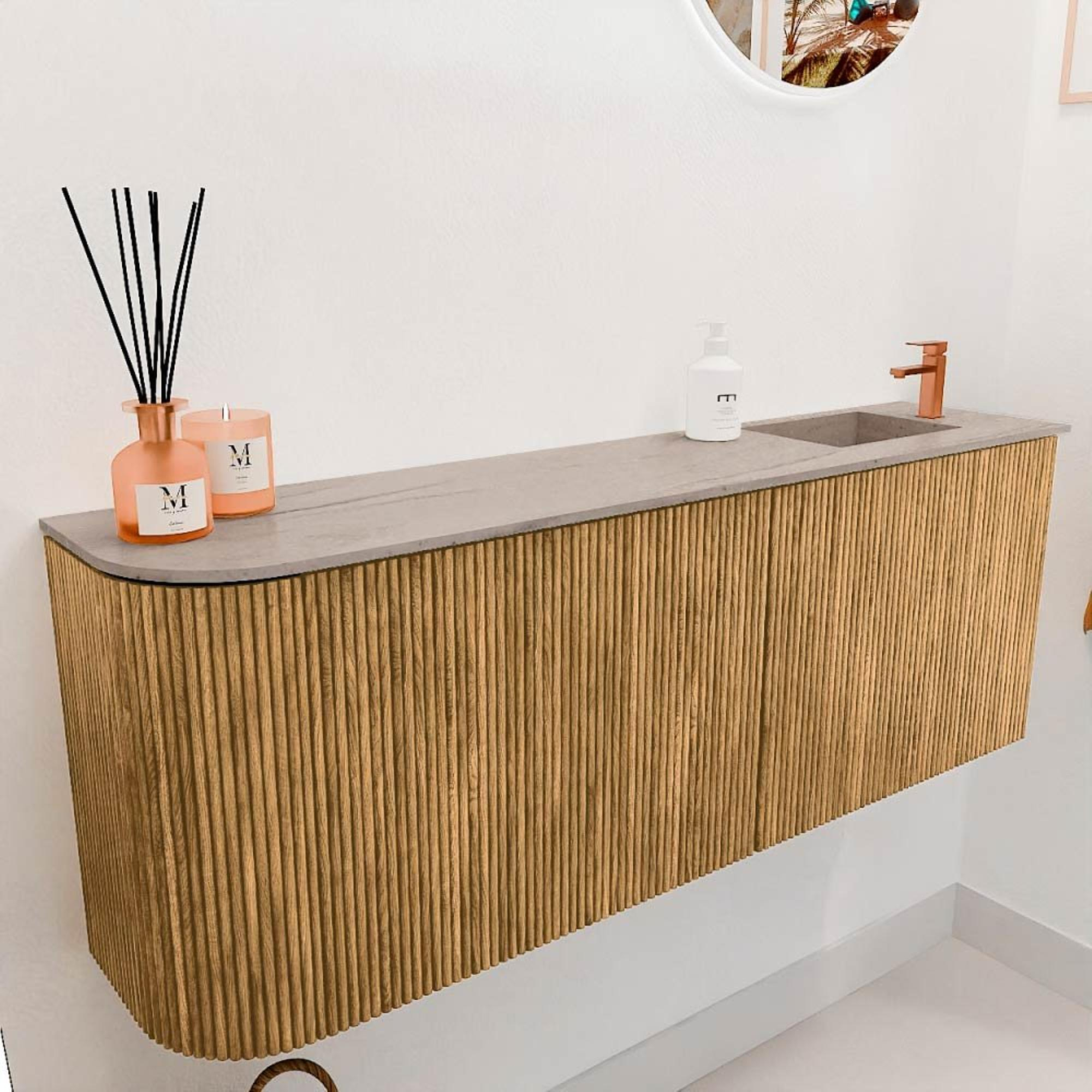 Dit meubel valt direct op door zijn tijdloze eiken kleur en de zachte ronding aan de linkerkant, die het geheel een moderne en toch warme uitstraling geeft. De combinatie met de wastafel in de kleur Saba maakt het design compleet en zorgt voor een harmonieuze sfeer. Door de subtiele details en hoogwaardige afwerking voeg je een vleugje luxe toe aan jouw badkamer, zonder dat het te opzichtig wordt. Zo creëer je een ruimte die uitnodigt tot ontspanning en waar je trots op kunt zijn.