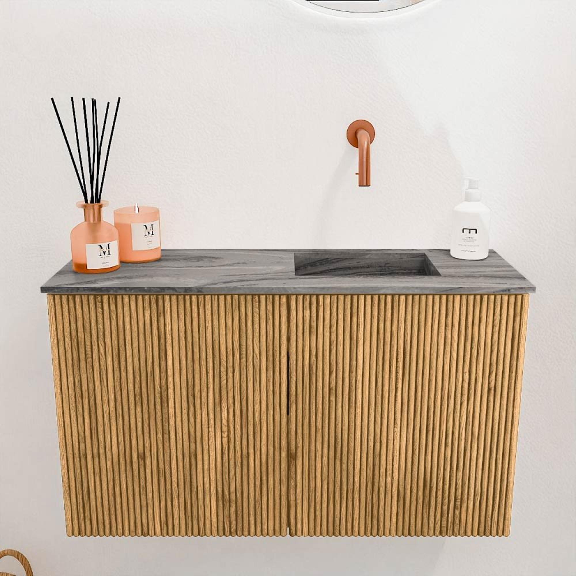 Het meubel is vervaardigd uit massief eikenhout met verticale groeven, wat een natuurlijke en luxe uitstraling geeft. Deze subtiele details maken het meubel tot een echte eyecatcher in je badkamer. De warme kleur Oak brengt sfeer en karakter, waardoor je badkamer een uitnodigende plek wordt om te ontspannen. De wastafel is rechts gepositioneerd en heeft een strakke, moderne vorm zonder kraangat, zodat je zelf de kraan kunt kiezen die het beste bij jouw stijl past. Dit meubel combineert tijdloos design met eigentijdse accenten, waardoor het moeiteloos aansluit bij diverse interieurstijlen.
