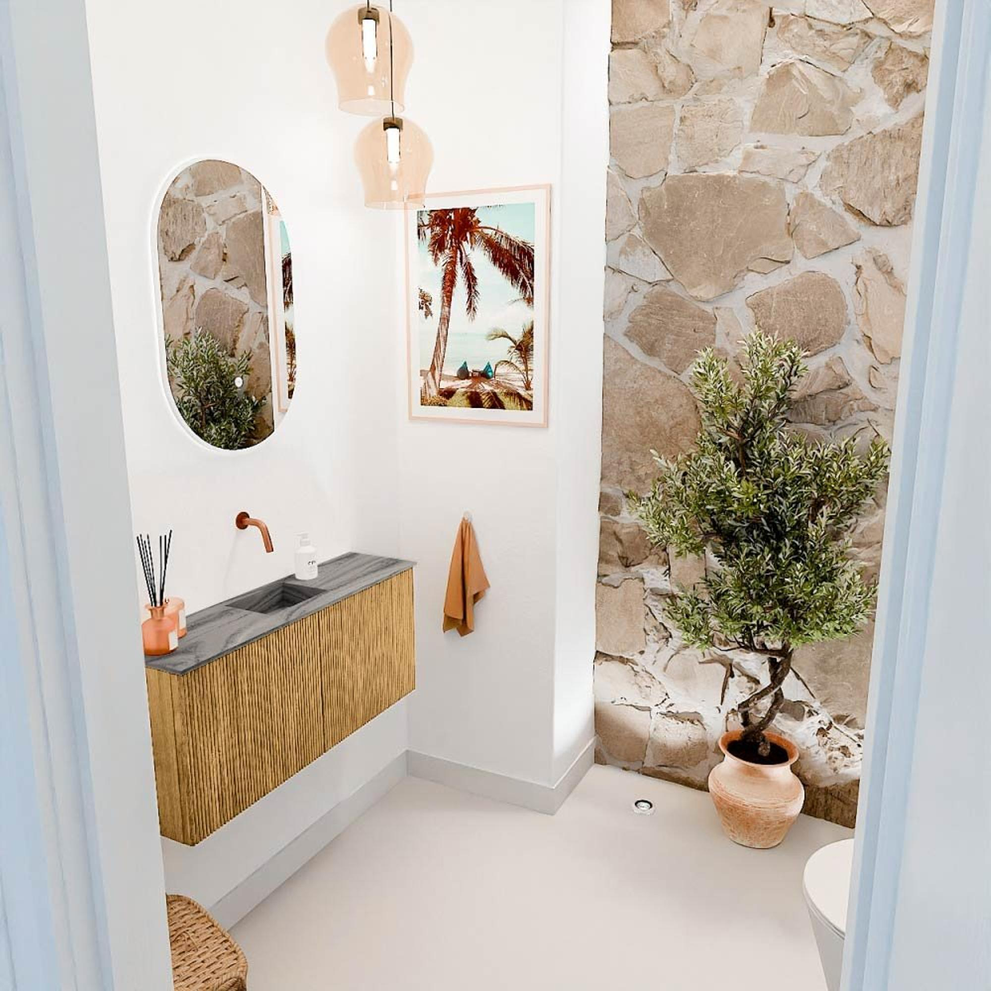 Dit meubel valt direct op door zijn natuurlijke eikenhouten front dat warmte en karakter toevoegt aan elke ruimte. De subtiele oak-kleur zorgt voor een tijdloze uitstraling die moeiteloos past bij verschillende badkamerstijlen, van modern tot klassiek. De wastafel in de kleur Sombra geeft een eigentijdse twist, waardoor het meubel een echte blikvanger wordt. Dankzij het minimalistische design met strakke lijnen blijft het geheel rustig en overzichtelijk, wat bijdraagt aan een ontspannen badkamerbeleving. Zo creëer je een stijlvolle plek waar je elke dag met plezier begint en eindigt.