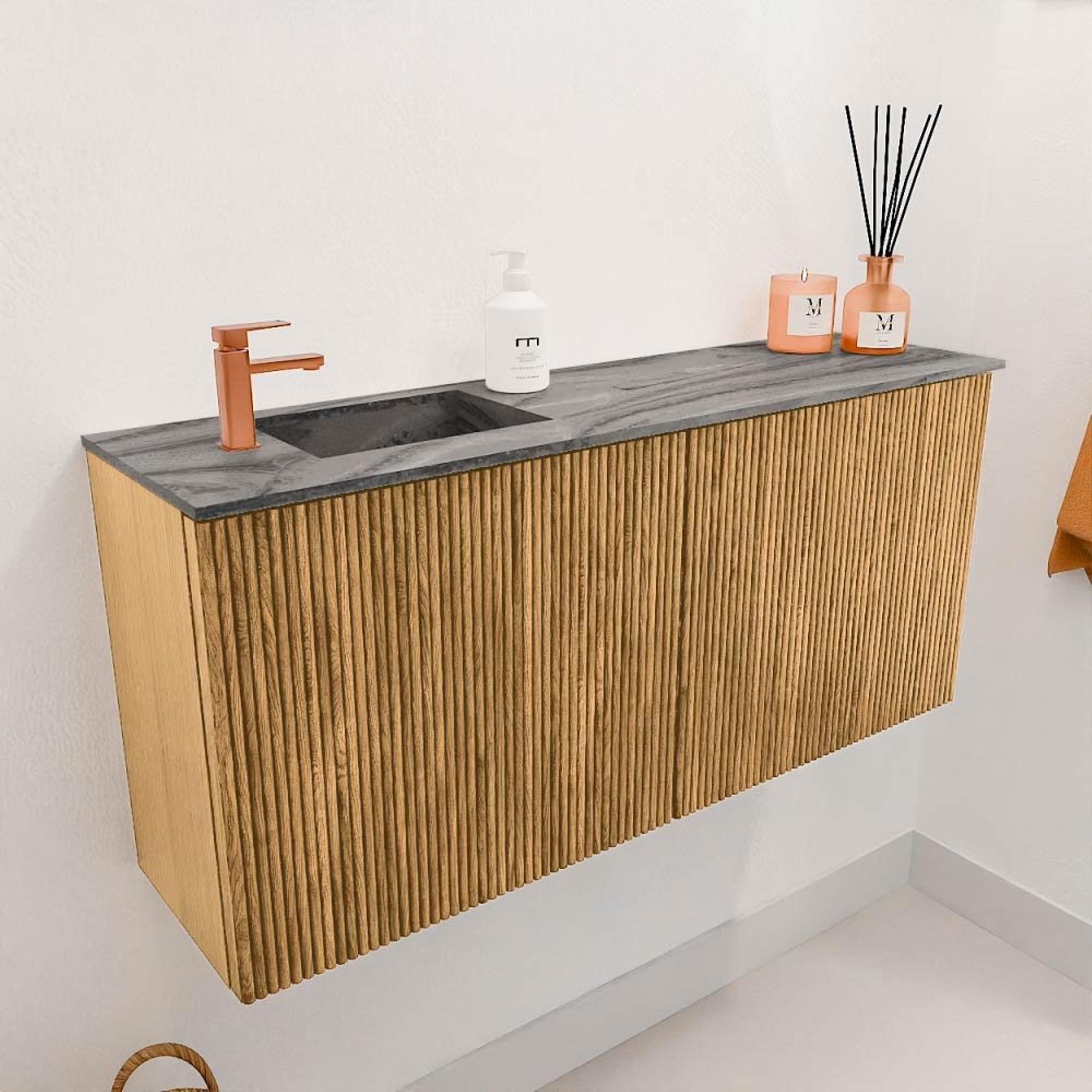 Het meubel valt meteen op door de warme eikenhouten afwerking met verticale groeven die een subtiel, maar onderscheidend patroon vormen. Dit geeft het geheel een natuurlijke en luxe uitstraling die tijdloos is. De combinatie met de grijze wastafel in de kleur Sombra zorgt voor een mooi contrast dat jouw badkamer een moderne en toch gezellige sfeer geeft. Dit meubel past moeiteloos in zowel klassieke als eigentijdse badkamers, waardoor je jarenlang kunt genieten van een stijlvol interieur zonder snel uitgekeken te raken.