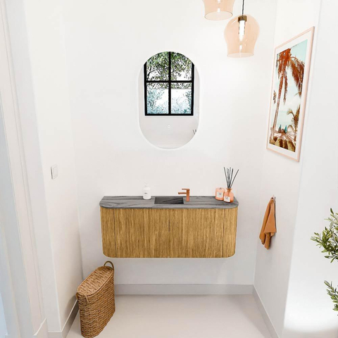 Met zijn elegante rondingen aan beide zijden en de verticale ribbelstructuur op de fronten, is dit meubel een toonbeeld van verfijnde vormgeving. De warme Oak-kleur brengt een natuurlijke rust in je badkamer en past moeiteloos bij diverse interieurstijlen, van modern tot klassiek. Door het gebruik van massief eikenhout straalt het meubel kwaliteit en duurzaamheid uit, waardoor het niet alleen mooi is om te zien, maar ook een lange levensduur garandeert. Zo geniet je jarenlang van een badkamer die er verzorgd en uitnodigend uitziet.