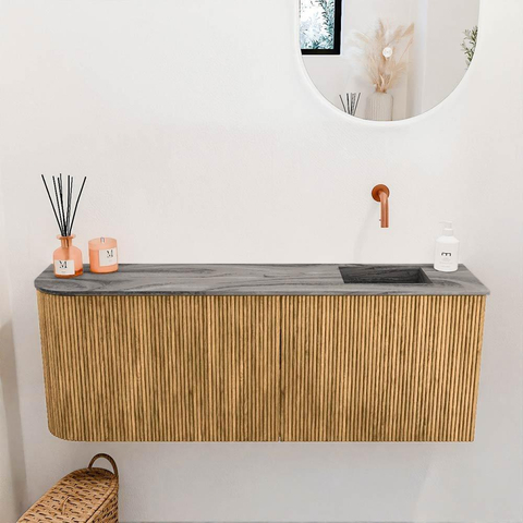 Dit meubel straalt tijdloze elegantie uit door het gebruik van natuurlijk eikenhout en het unieke afgeronde ontwerp aan de linkerkant. Het warme hout zorgt voor een uitnodigende sfeer, terwijl de strakke lijnen het geheel modern houden. Zo voeg je een stijlvol element toe dat moeiteloos combineert met verschillende badkamerstijlen. De subtiele ronding maakt het meubel bovendien onderscheidend en geeft jouw badkamer een persoonlijke touch die je nergens anders vindt.